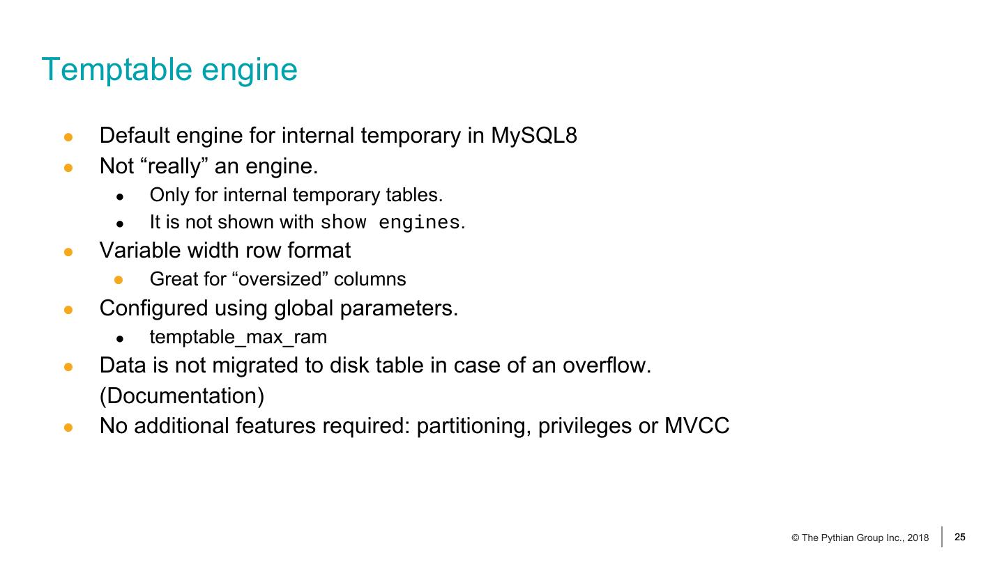 23 .Temptable engine ● Default engine for internal temporary in MySQL8 ● Not “really” an engine. ● Only for internal temporary tables. ● It is not shown with show engines. ● Variable width row format ● Great for “oversized” columns ● Configured using global parameters. ● temptable_max_ram ● Data is not migrated to disk table in case of an overflow. (Documentation) ● No additional features required: partitioning, privileges or MVCC © The Pythian Group Inc., 2018 25