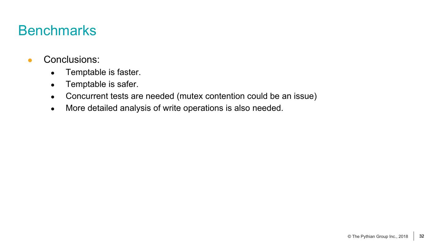 29 .Benchmarks ● One large temporary table without sorting (cursor). ● Temptable is 13% faster. ● Temptable needs 1% Write operations.(!) ● One large temporary table with sorting. ● Temptable is 15% faster. ● Temptable again needs 1% Write operations.(!) ● Multiple small operations without sorting ● Temptable is 42% faster. ● Temptable again needs 1% Write operations © The Pythian Group Inc., 2018 31