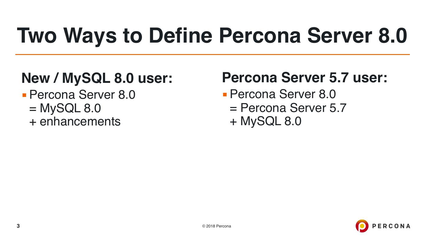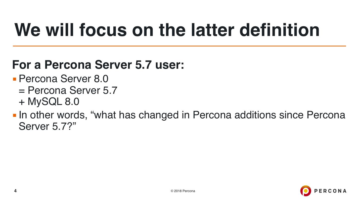 3 .Two Ways to Define Percona Server 8.0 New / MySQL 8.0 user: Percona Server 5.7 user: ▪ Percona Server 8.0 ▪ Percona Server 8.0 = MySQL 8.0 = Percona Server 5.7 + enhancements + MySQL 8.0 3 © 2018 Percona