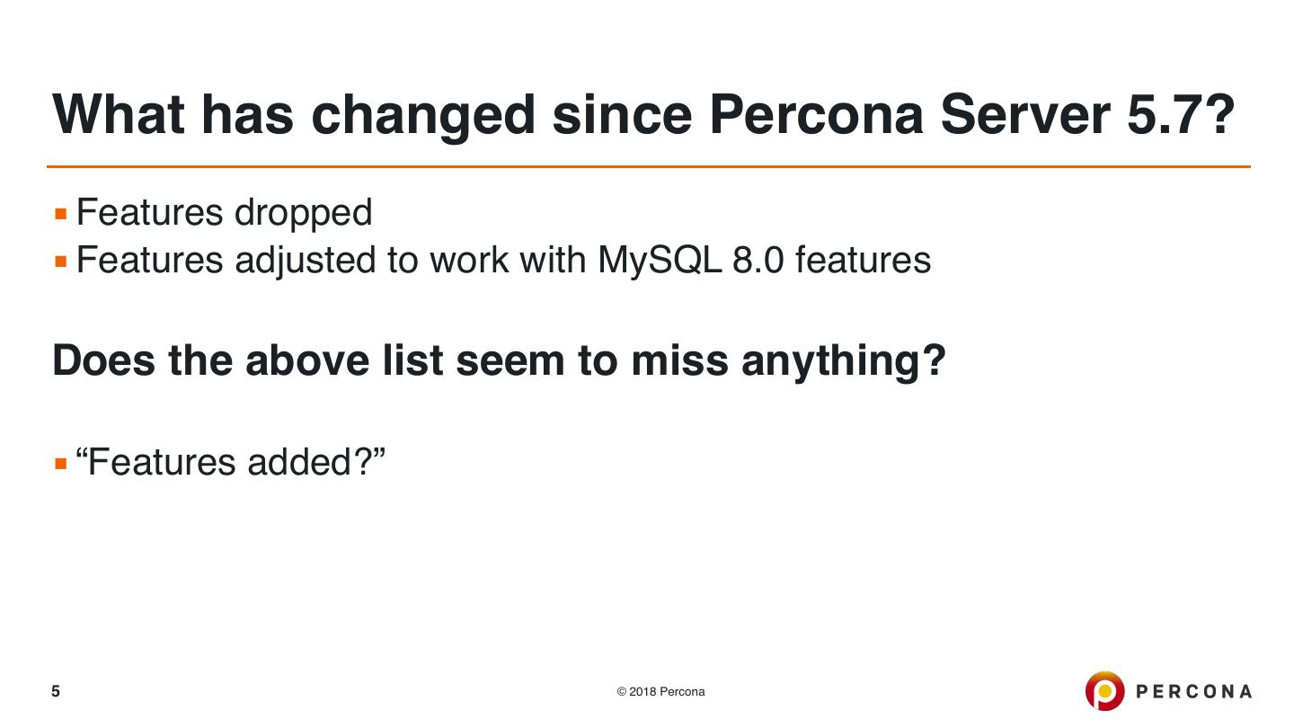 4 .We will focus on the latter definition For a Percona Server 5.7 user: ▪ Percona Server 8.0 = Percona Server 5.7 + MySQL 8.0 ▪ In other words, “what has changed in Percona additions since Percona Server 5.7?” 4 © 2018 Percona