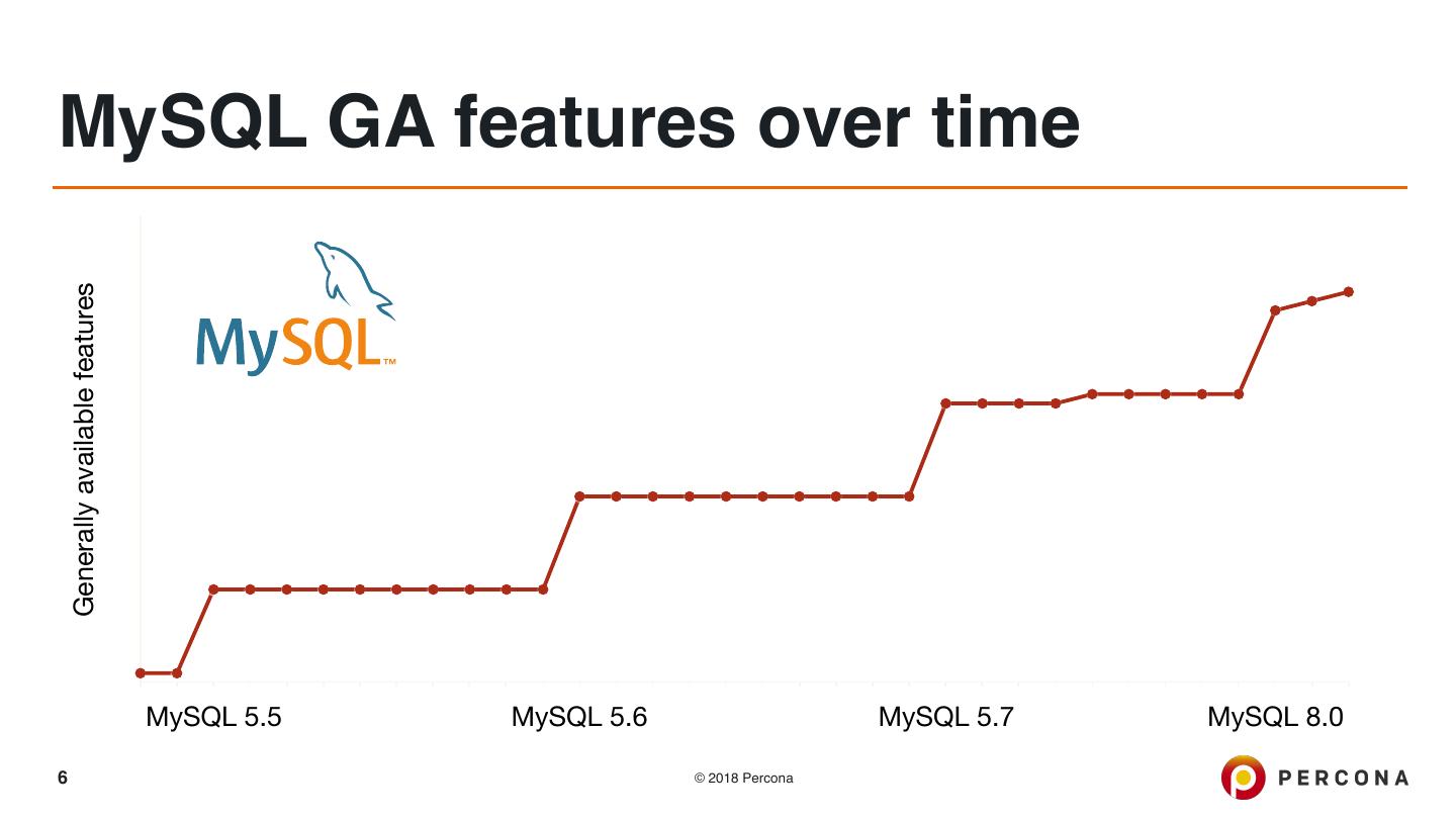 6 .MySQL GA features over time Generally available features MySQL 5.5 MySQL 5.6 MySQL 5.7 MySQL 8.0 6 © 2018 Percona