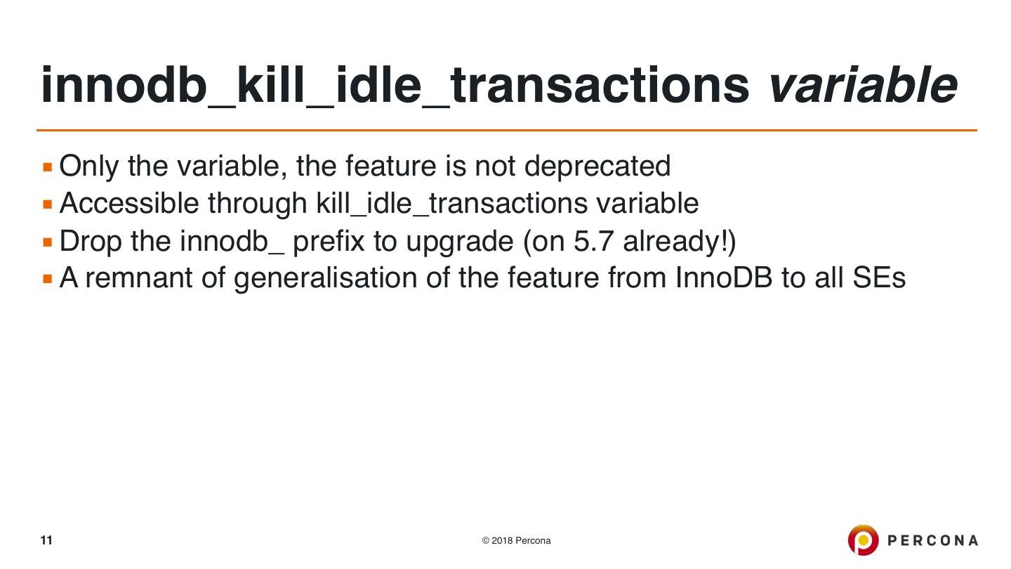 11 .innodb_kill_idle_transactions variable ▪ Only the variable, the feature is not deprecated ▪ Accessible through kill_idle_transactions variable ▪ Drop the innodb_ prefix to upgrade (on 5.7 already!) ▪ A remnant of generalisation of the feature from InnoDB to all SEs 11 © 2018 Percona