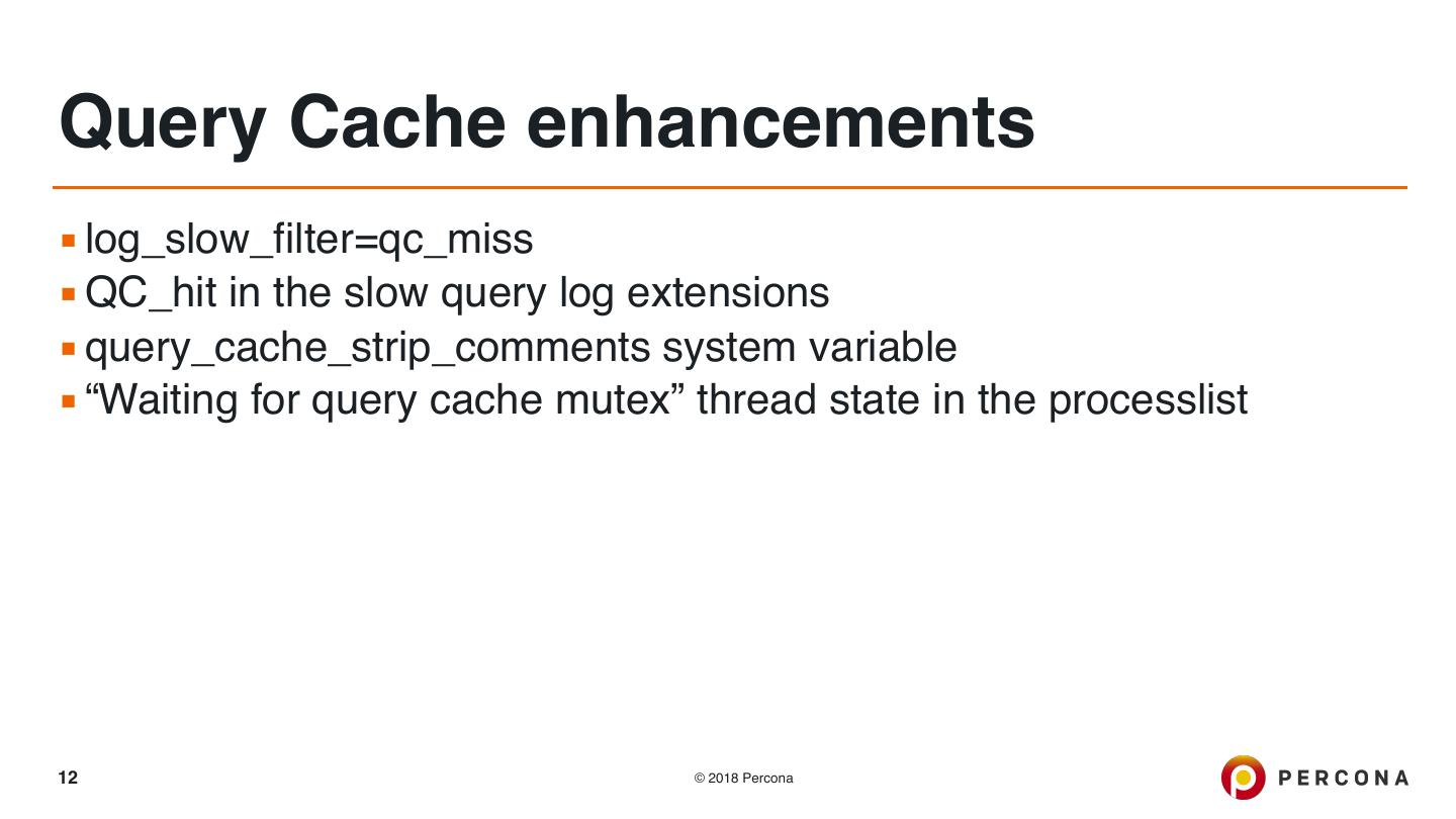 12 .Query Cache enhancements ▪ log_slow_filter=qc_miss ▪ QC_hit in the slow query log extensions ▪ query_cache_strip_comments system variable ▪ “Waiting for query cache mutex” thread state in the processlist 12 © 2018 Percona