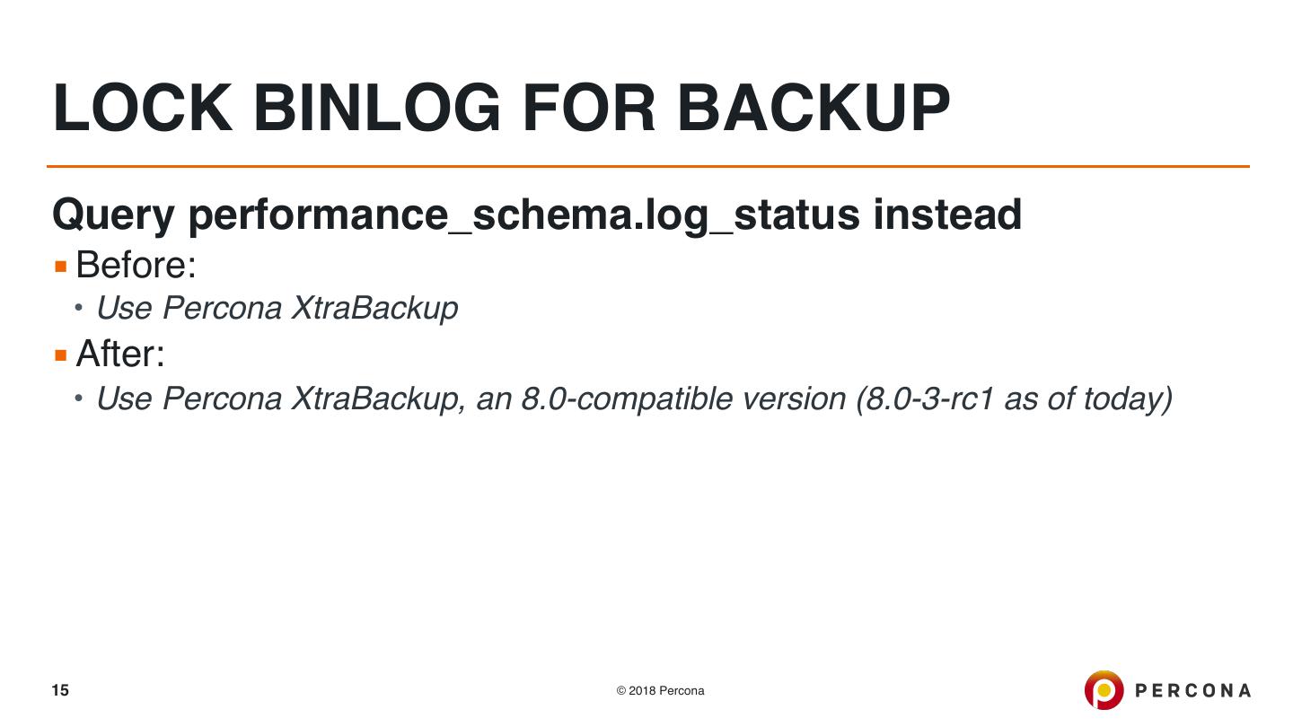 15 .LOCK BINLOG FOR BACKUP Query performance_schema.log_status instead ▪ Before: • Use Percona XtraBackup ▪ After: • Use Percona XtraBackup, an 8.0-compatible version (8.0-3-rc1 as of today) 15 © 2018 Percona
