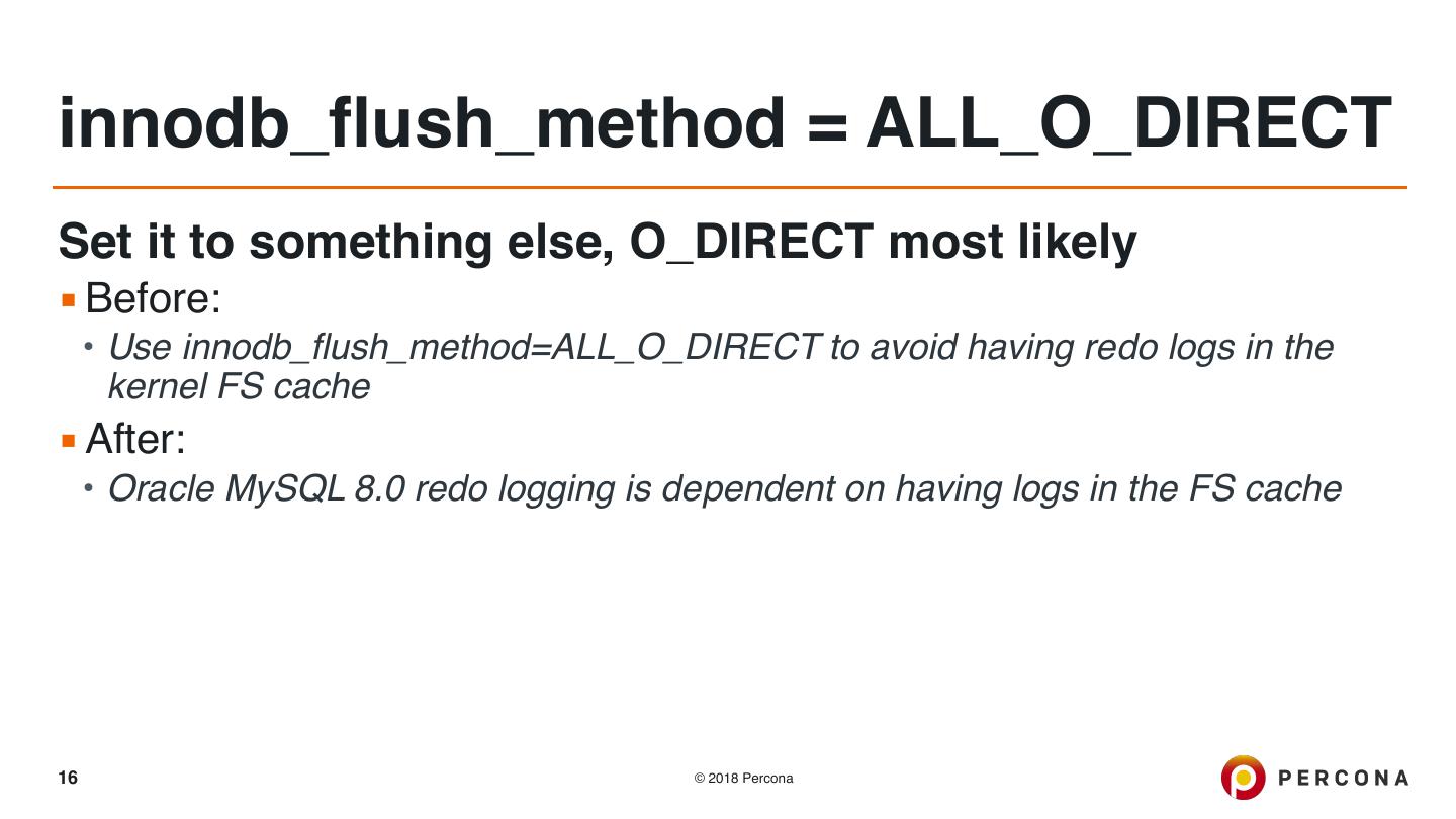 16 .innodb_flush_method = ALL_O_DIRECT Set it to something else, O_DIRECT most likely ▪ Before: • Use innodb_flush_method=ALL_O_DIRECT to avoid having redo logs in the kernel FS cache ▪ After: • Oracle MySQL 8.0 redo logging is dependent on having logs in the FS cache 16 © 2018 Percona