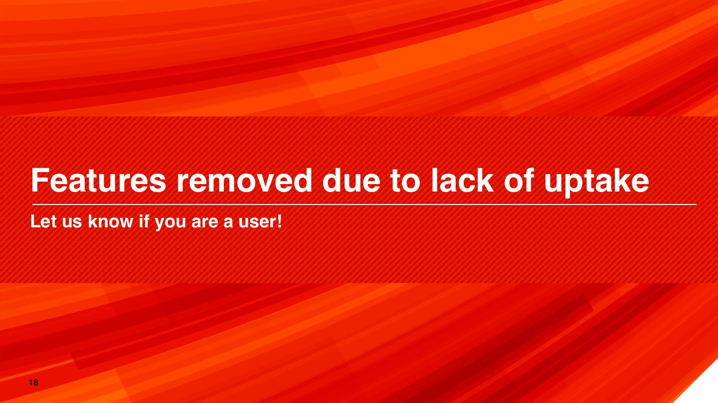 19 .Features removed due to lack of uptake ▪ INFORMATION_SCHEMA.XTRADB_RSEG ▪ Expanded program option modifiers ▪ Utility user ▪ pseudo_server_id ▪ CSV_MODE ▪ max_slowlog_files and max_slowlog_size ▪ innodb_show_verbose_locks 19 © 2018 Percona