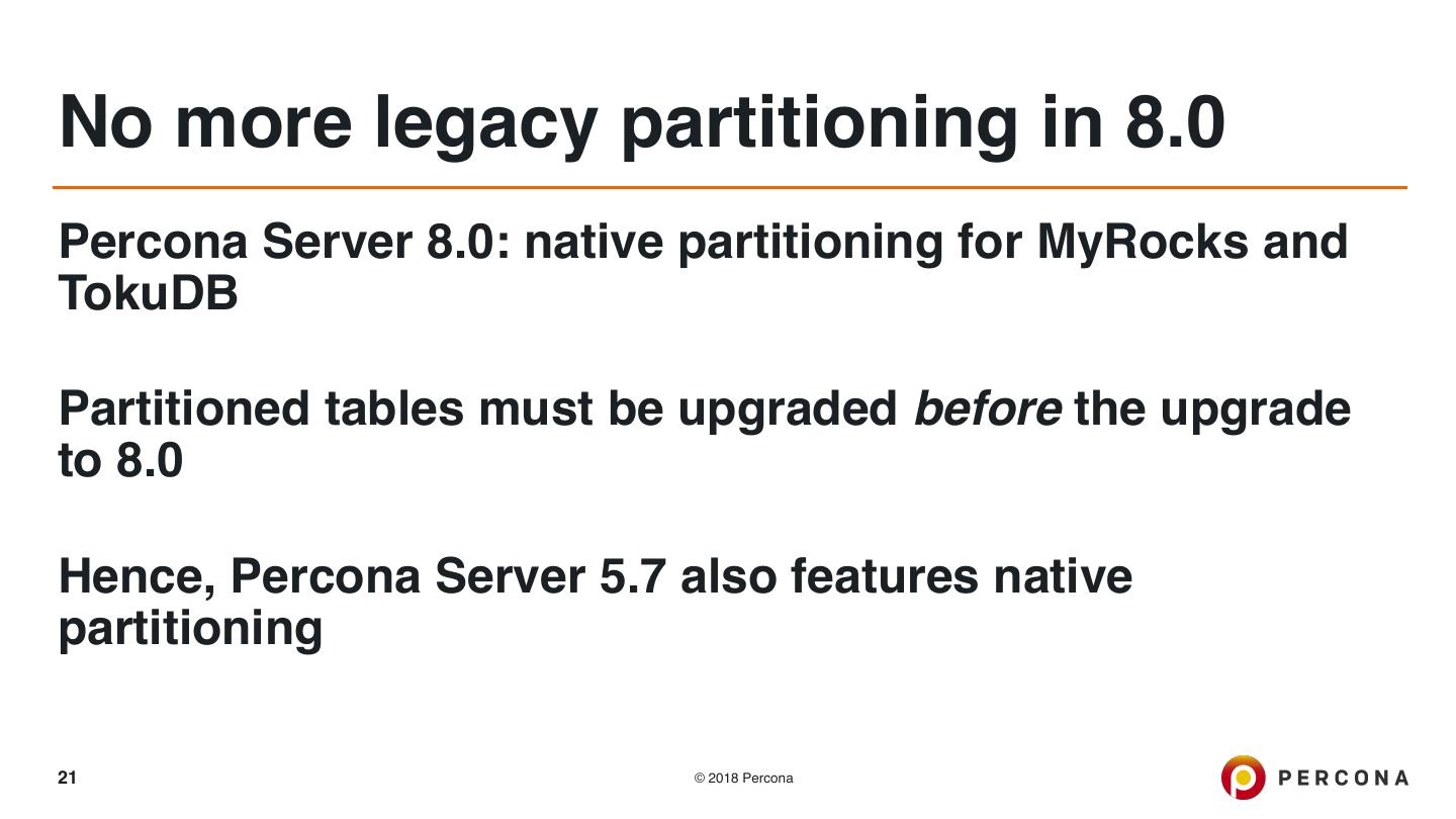21 .No more legacy partitioning in 8.0 Percona Server 8.0: native partitioning for MyRocks and TokuDB Partitioned tables must be upgraded before the upgrade to 8.0 Hence, Percona Server 5.7 also features native partitioning 21 © 2018 Percona