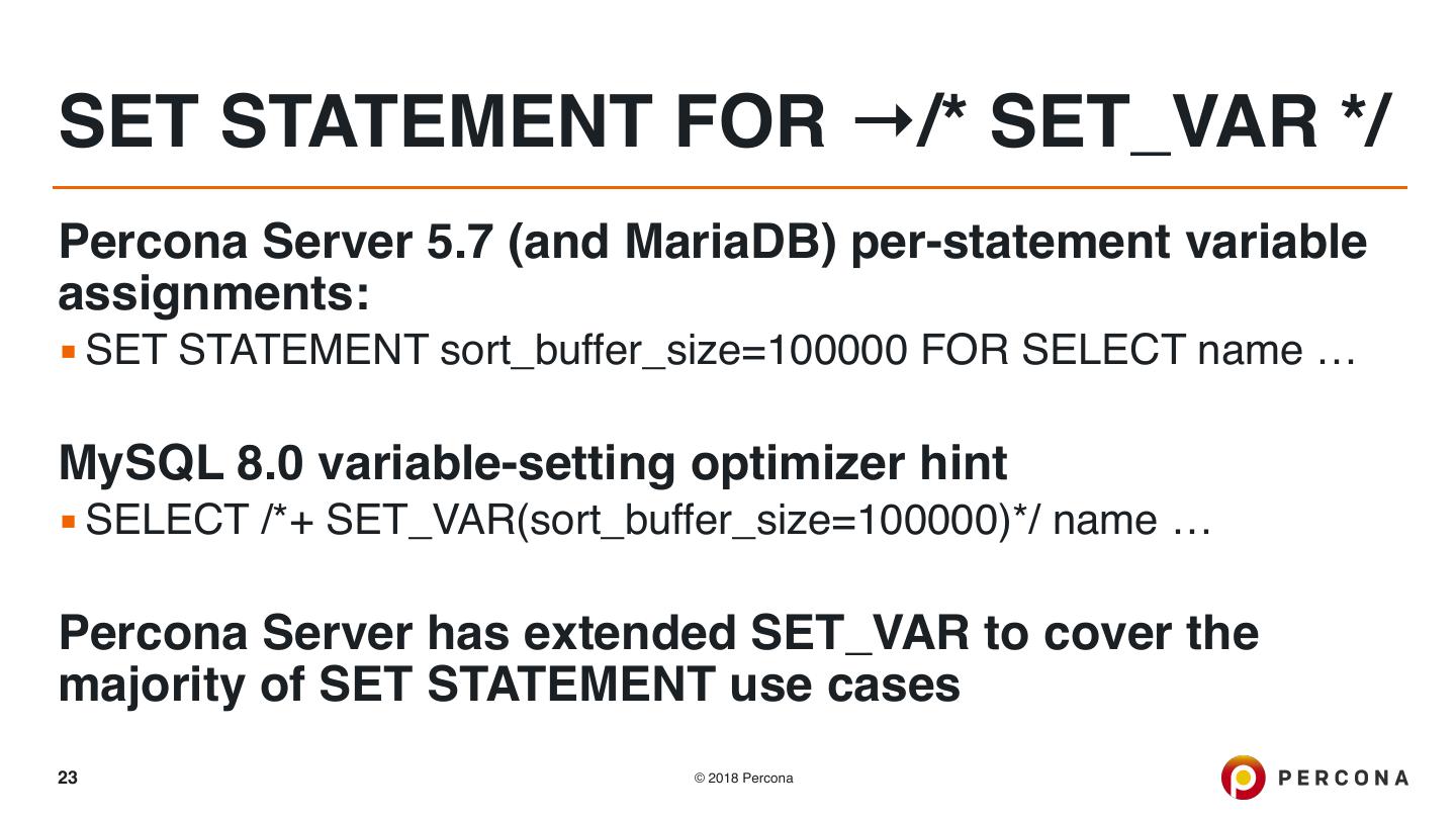 23 .SET STATEMENT FOR →/* SET_VAR */ Percona Server 5.7 (and MariaDB) per-statement variable assignments: ▪ SET STATEMENT sort_buffer_size=100000 FOR SELECT name … MySQL 8.0 variable-setting optimizer hint ▪ SELECT /*+ SET_VAR(sort_buffer_size=100000)*/ name … Percona Server has extended SET_VAR to cover the majority of SET STATEMENT use cases 23 © 2018 Percona