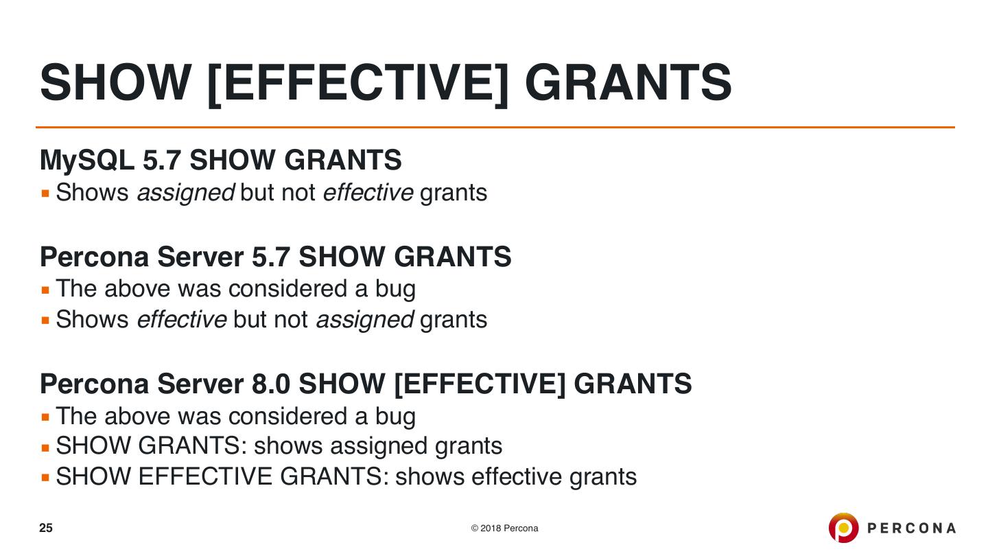 25 .SHOW [EFFECTIVE] GRANTS MySQL 5.7 SHOW GRANTS ▪ Shows assigned but not effective grants Percona Server 5.7 SHOW GRANTS ▪ The above was considered a bug ▪ Shows effective but not assigned grants Percona Server 8.0 SHOW [EFFECTIVE] GRANTS ▪ The above was considered a bug ▪ SHOW GRANTS: shows assigned grants ▪ SHOW EFFECTIVE GRANTS: shows effective grants 25 © 2018 Percona