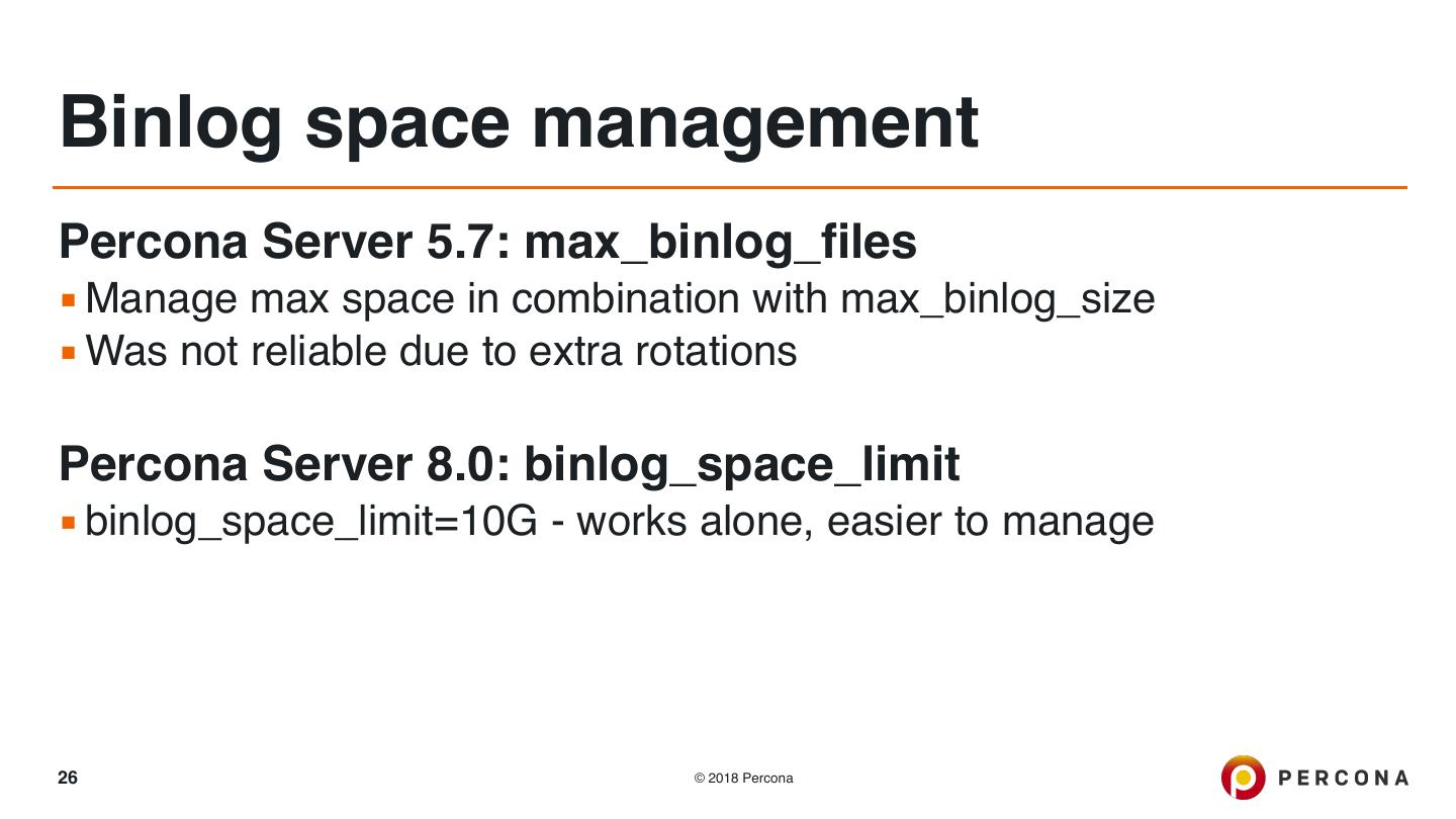 26 .Binlog space management Percona Server 5.7: max_binlog_files ▪ Manage max space in combination with max_binlog_size ▪ Was not reliable due to extra rotations Percona Server 8.0: binlog_space_limit ▪ binlog_space_limit=10G - works alone, easier to manage 26 © 2018 Percona