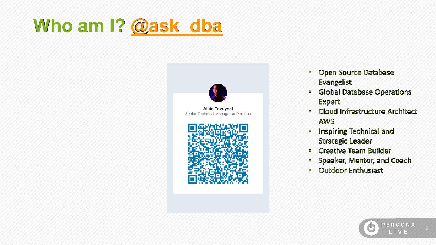 1 .Databases Gone Serverless Alkin Tezuysal (@ask_dba) Sr. Technical Manager, Percona