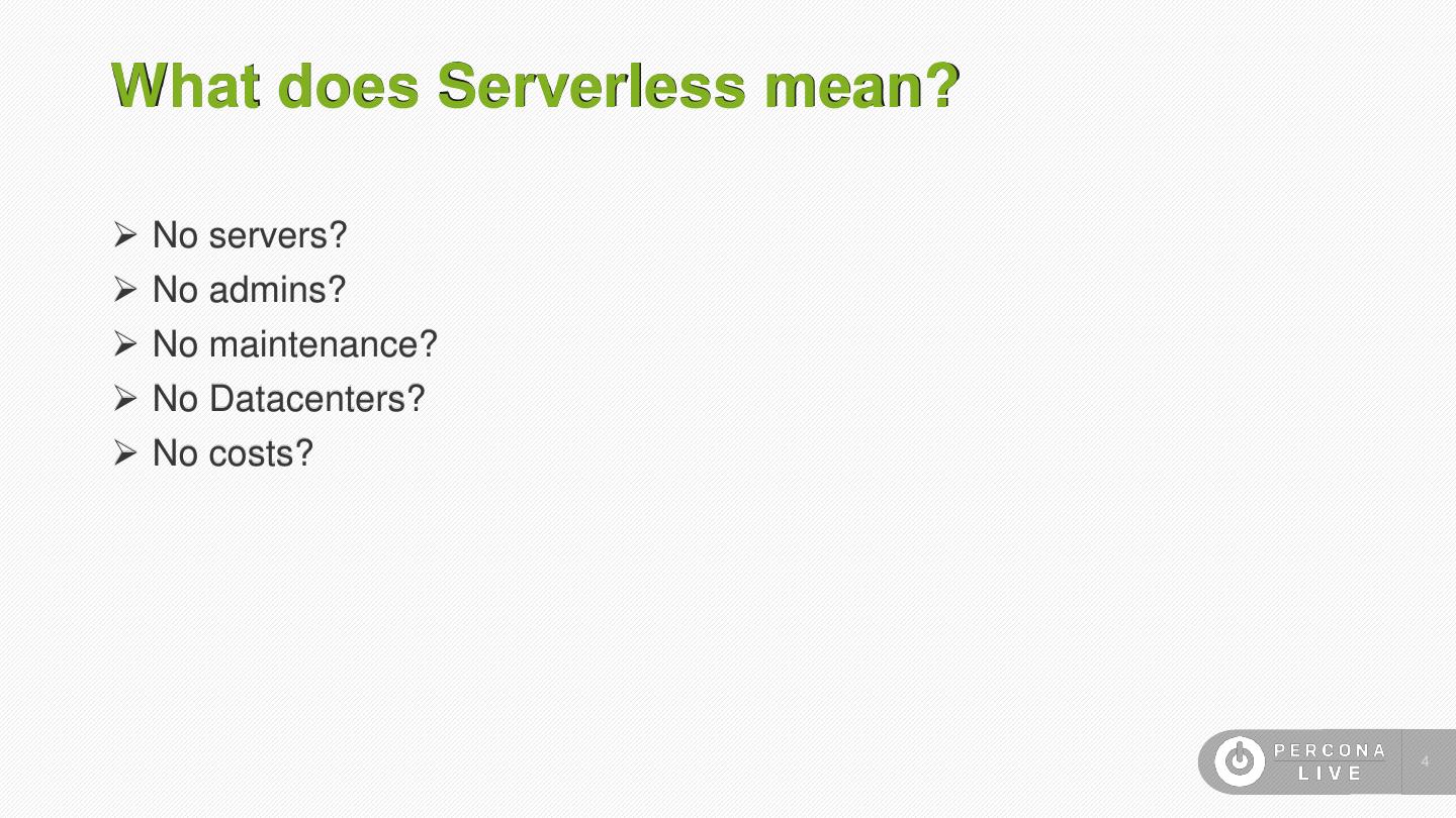 4 .What does Serverless mean? ➢ No servers? ➢ No admins? ➢ No maintenance? ➢ No Datacenters? ➢ No costs? 4