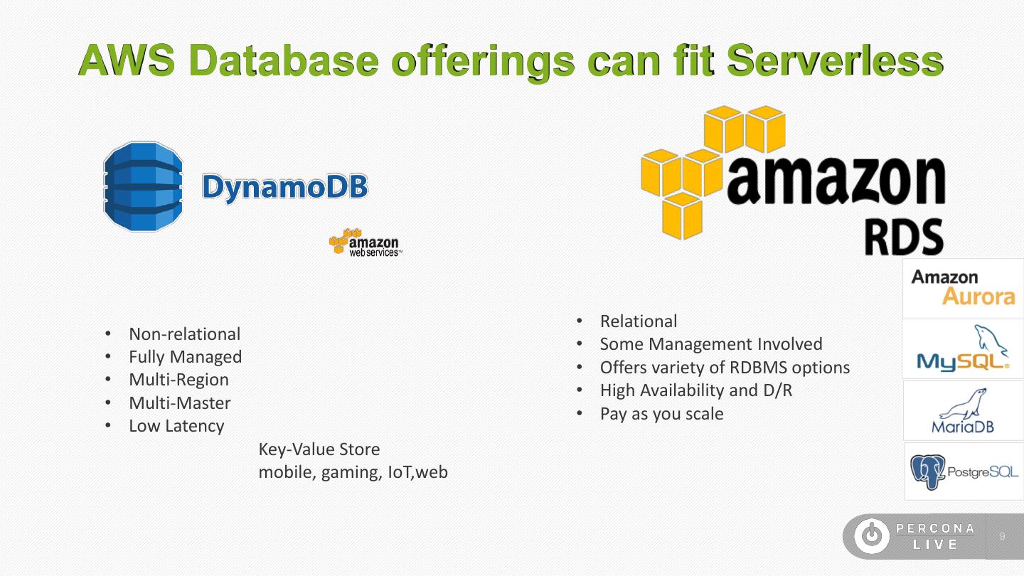 9 .AWS Database offerings can fit Serverless • Relational • Non-relational • Some Management Involved • Fully Managed • Offers variety of RDBMS options • Multi-Region • High Availability and D/R • Multi-Master • Pay as you scale • Low Latency Key-Value Store mobile, gaming, IoT,web 9