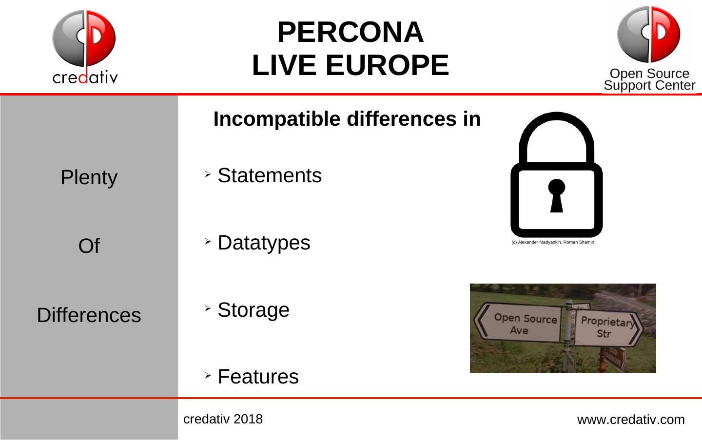 6 . PERCONA LIVE EUROPE Incompatible differences in Plenty ➢ Statements Of ➢ Datatypes (c) Alexander Madyankin, Roman Shamin Differences ➢ Storage ➢ Features credativ 2018 www.credativ.com