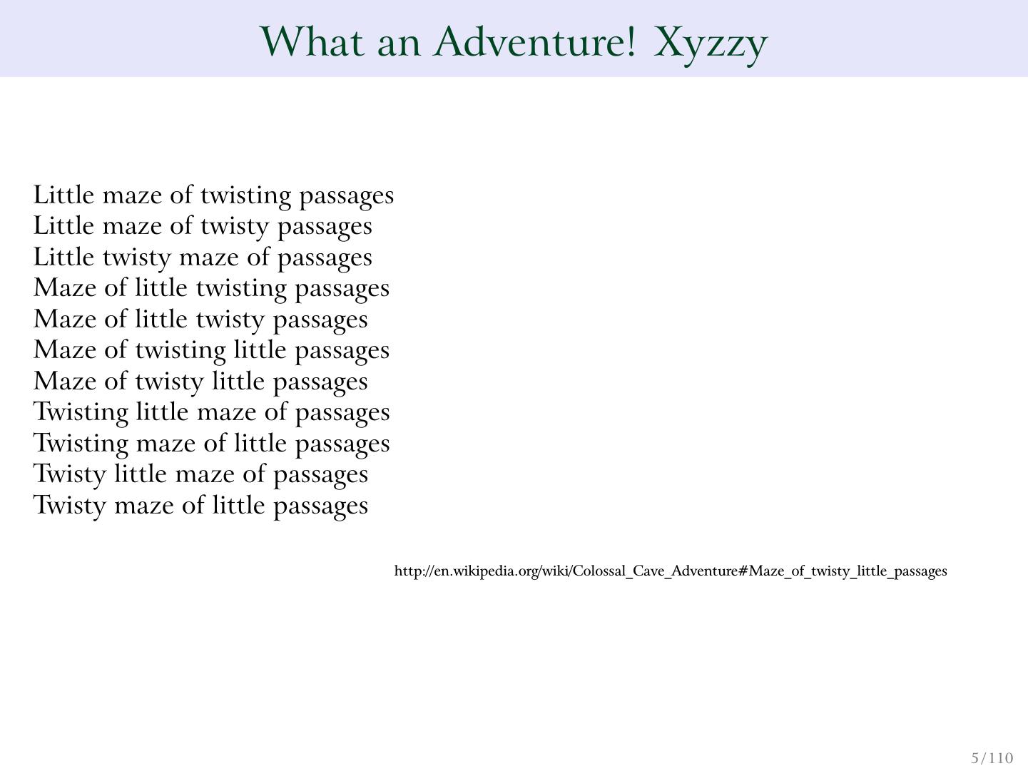 5 . What an Adventure! Xyzzy Little maze of twisting passages Little maze of twisty passages Little twisty maze of passages Maze of little twisting passages Maze of little twisty passages Maze of twisting little passages Maze of twisty little passages Twisting little maze of passages Twisting maze of little passages Twisty little maze of passages Twisty maze of little passages http://en.wikipedia.org/wiki/Colossal_Cave_Adventure#Maze_of_twisty_little_passages 5 / 110