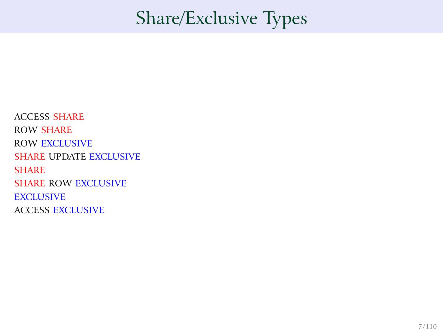 7 . Share/Exclusive Types ACCESS SHARE ROW SHARE ROW EXCLUSIVE SHARE UPDATE EXCLUSIVE SHARE SHARE ROW EXCLUSIVE EXCLUSIVE ACCESS EXCLUSIVE 7 / 110