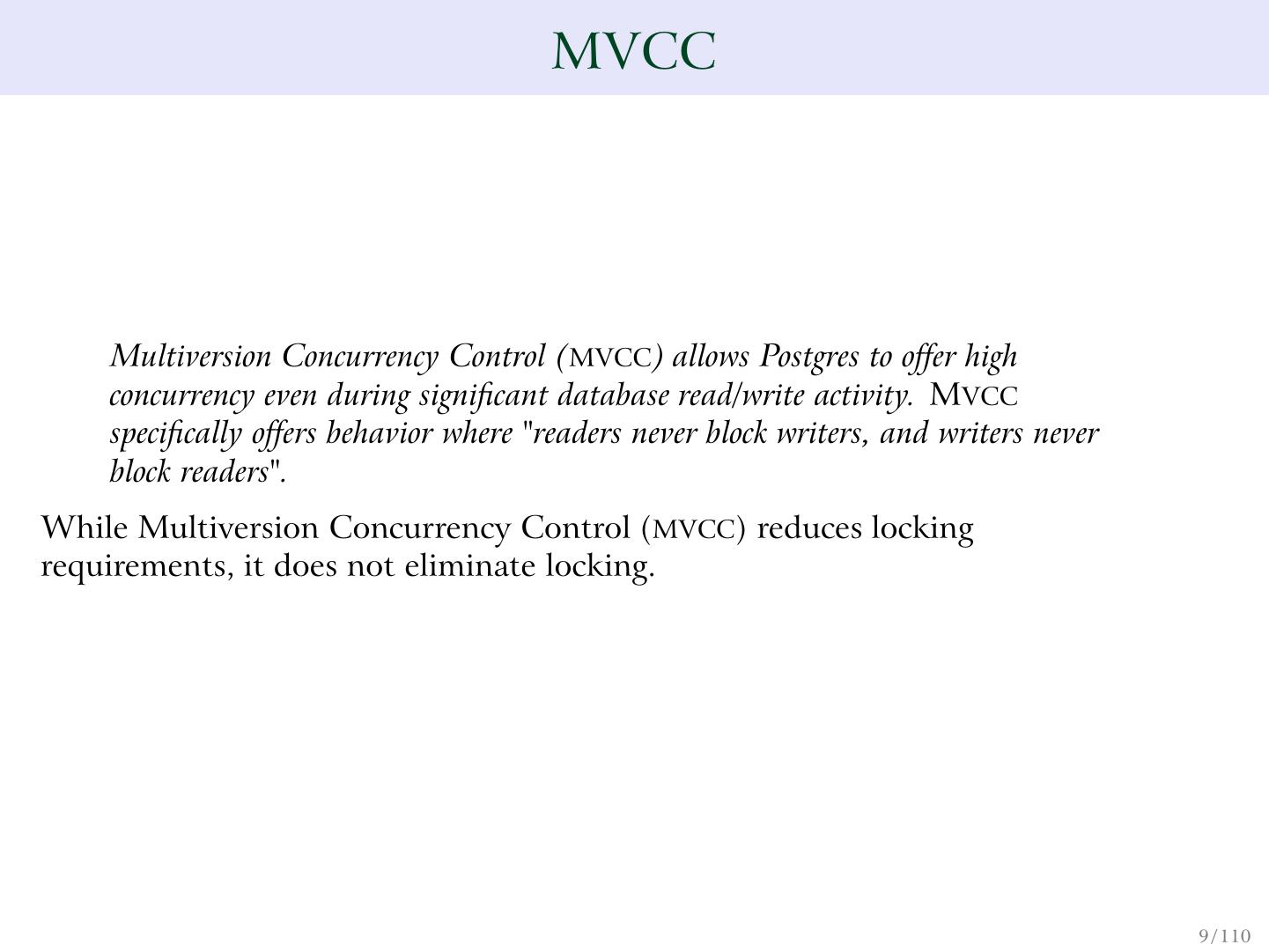 9 . MVCC Multiversion Concurrency Control (MVCC) allows Postgres to offer high concurrency even during significant database read/write activity. MVCC specifically offers behavior where "readers never block writers, and writers never block readers". While Multiversion Concurrency Control (MVCC) reduces locking requirements, it does not eliminate locking. 9 / 110