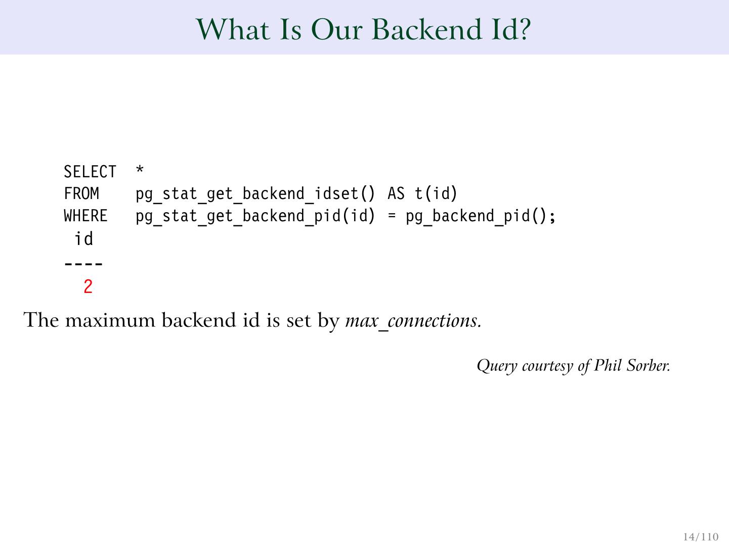 14 . What Is Our Backend Id? SELECT * FROM pg_stat_get_backend_idset() AS t(id) WHERE pg_stat_get_backend_pid(id) = pg_backend_pid(); id ---- 2 The maximum backend id is set by max_connections. Query courtesy of Phil Sorber. 14 / 110