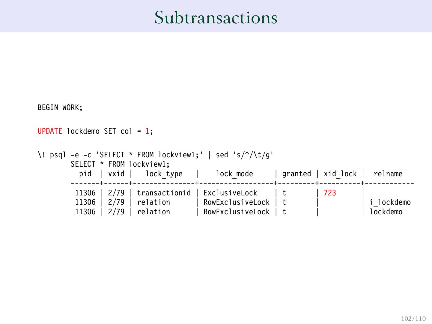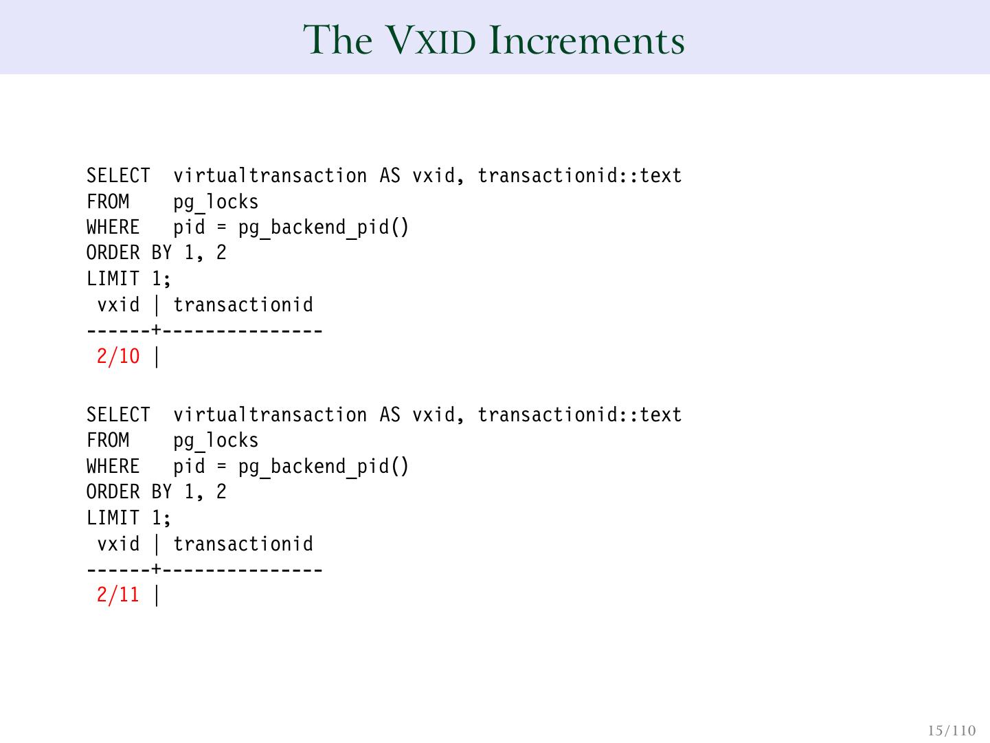 15 . The VXID Increments SELECT virtualtransaction AS vxid, transactionid::text FROM pg_locks WHERE pid = pg_backend_pid() ORDER BY 1, 2 LIMIT 1; vxid | transactionid ------+--------------- 2/10 | SELECT virtualtransaction AS vxid, transactionid::text FROM pg_locks WHERE pid = pg_backend_pid() ORDER BY 1, 2 LIMIT 1; vxid | transactionid ------+--------------- 2/11 | 15 / 110