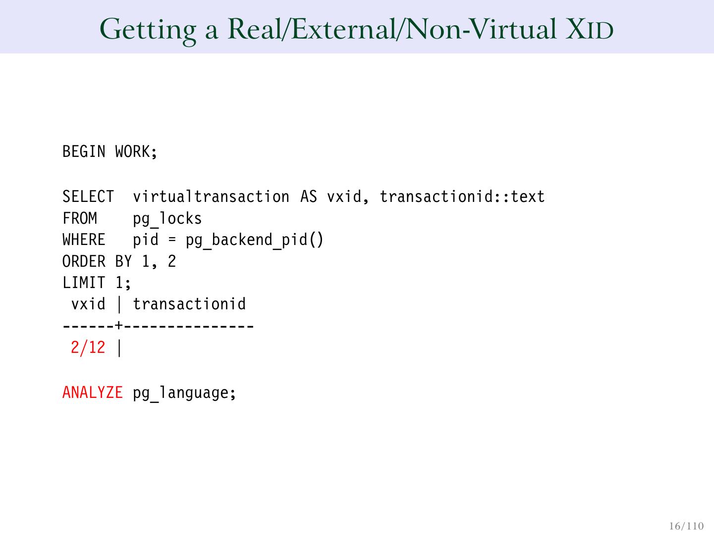 16 . Getting a Real/External/Non-Virtual XID BEGIN WORK; SELECT virtualtransaction AS vxid, transactionid::text FROM pg_locks WHERE pid = pg_backend_pid() ORDER BY 1, 2 LIMIT 1; vxid | transactionid ------+--------------- 2/12 | ANALYZE pg_language; 16 / 110