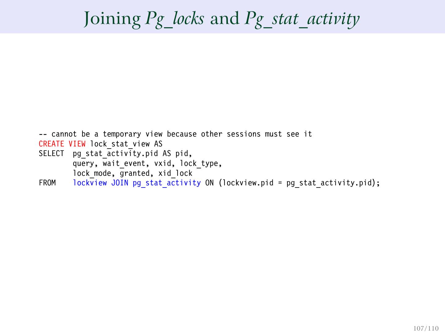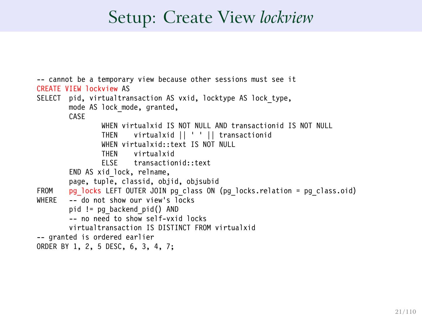 21 . Setup: Create View lockview -- cannot be a temporary view because other sessions must see it CREATE VIEW lockview AS SELECT pid, virtualtransaction AS vxid, locktype AS lock_type, mode AS lock_mode, granted, CASE WHEN virtualxid IS NOT NULL AND transactionid IS NOT NULL THEN virtualxid || ’ ’ || transactionid WHEN virtualxid::text IS NOT NULL THEN virtualxid ELSE transactionid::text END AS xid_lock, relname, page, tuple, classid, objid, objsubid FROM pg_locks LEFT OUTER JOIN pg_class ON (pg_locks.relation = pg_class.oid) WHERE -- do not show our view’s locks pid != pg_backend_pid() AND -- no need to show self-vxid locks virtualtransaction IS DISTINCT FROM virtualxid -- granted is ordered earlier ORDER BY 1, 2, 5 DESC, 6, 3, 4, 7; 21 / 110
