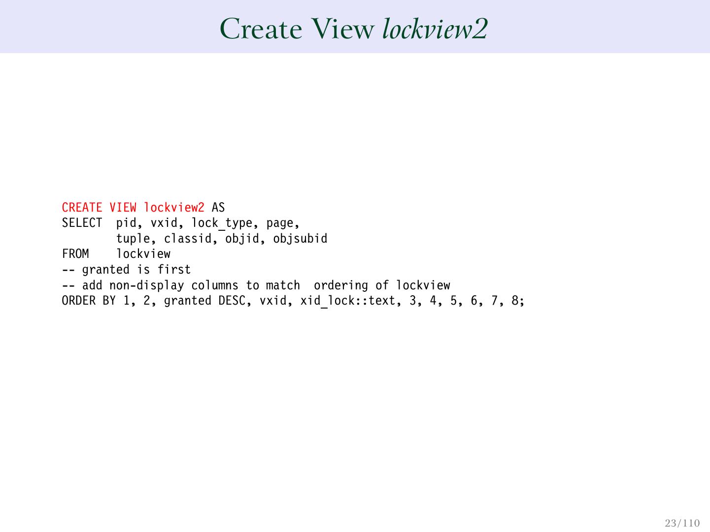22 . Create View lockview1 CREATE VIEW lockview1 AS SELECT pid, vxid, lock_type, lock_mode, granted, xid_lock, relname FROM lockview -- granted is ordered earlier ORDER BY 1, 2, 5 DESC, 6, 3, 4, 7; 22 / 110