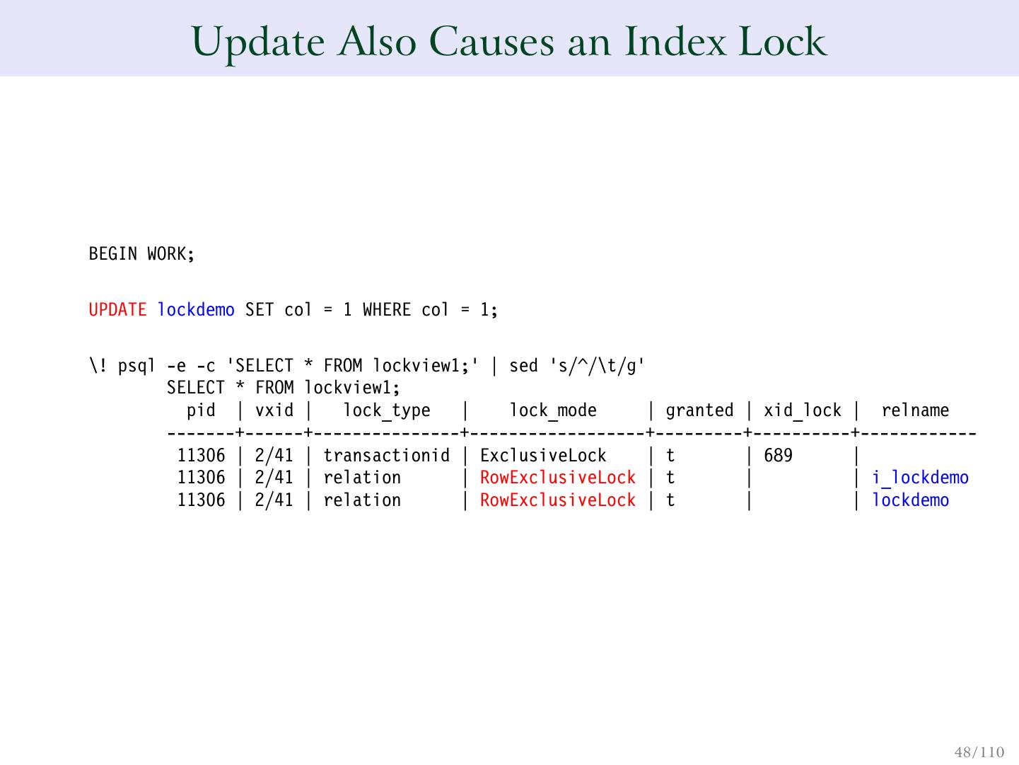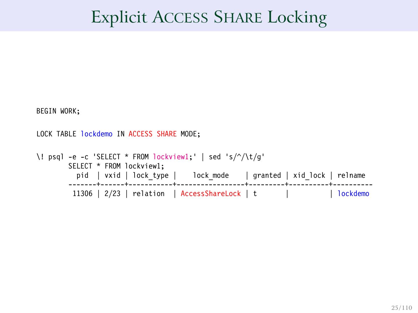 25 . Explicit ACCESS SHARE Locking BEGIN WORK; LOCK TABLE lockdemo IN ACCESS SHARE MODE; \! psql -e -c ’SELECT * FROM lockview1;’ | sed ’s/^/\t/g’ SELECT * FROM lockview1; pid | vxid | lock_type | lock_mode | granted | xid_lock | relname -------+------+-----------+-----------------+---------+----------+---------- 11306 | 2/23 | relation | AccessShareLock | t | | lockdemo 25 / 110
