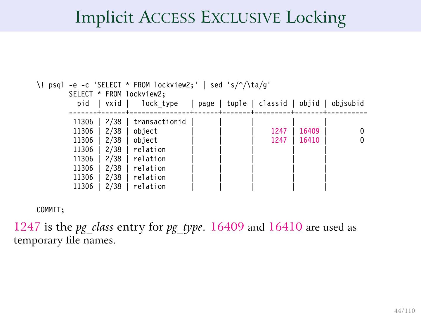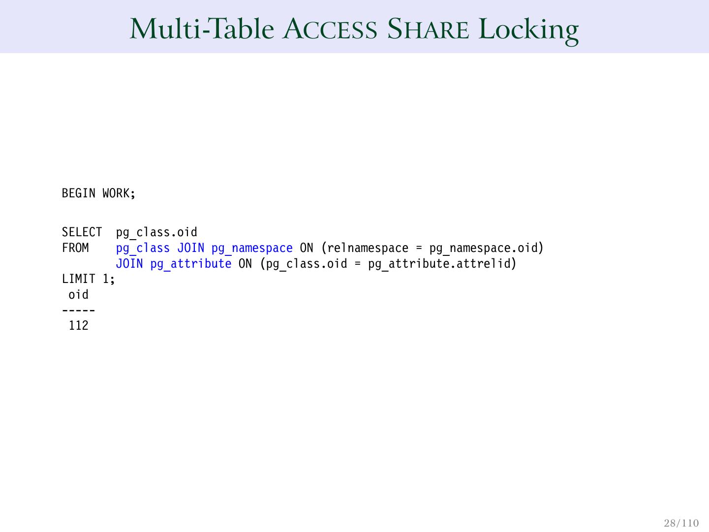 28 . Multi-Table ACCESS SHARE Locking BEGIN WORK; SELECT pg_class.oid FROM pg_class JOIN pg_namespace ON (relnamespace = pg_namespace.oid) JOIN pg_attribute ON (pg_class.oid = pg_attribute.attrelid) LIMIT 1; oid ----- 112 28 / 110