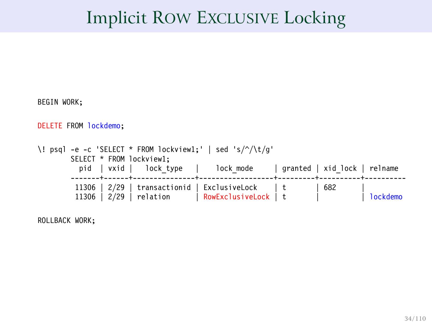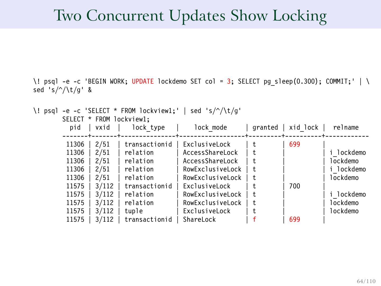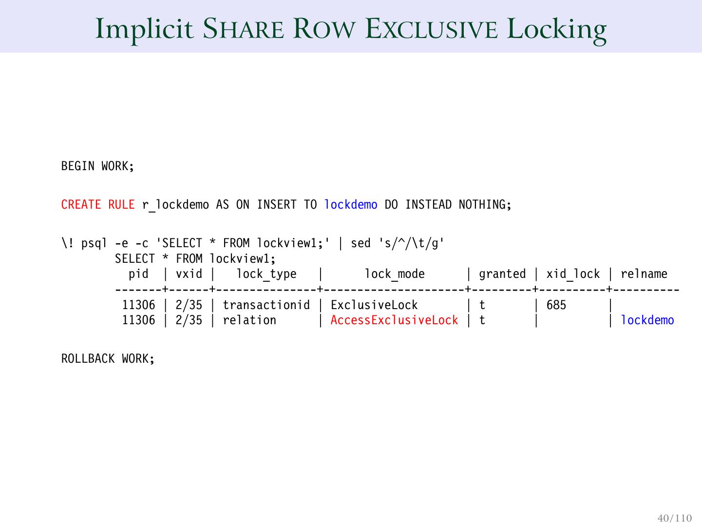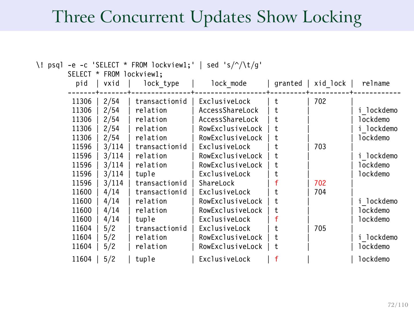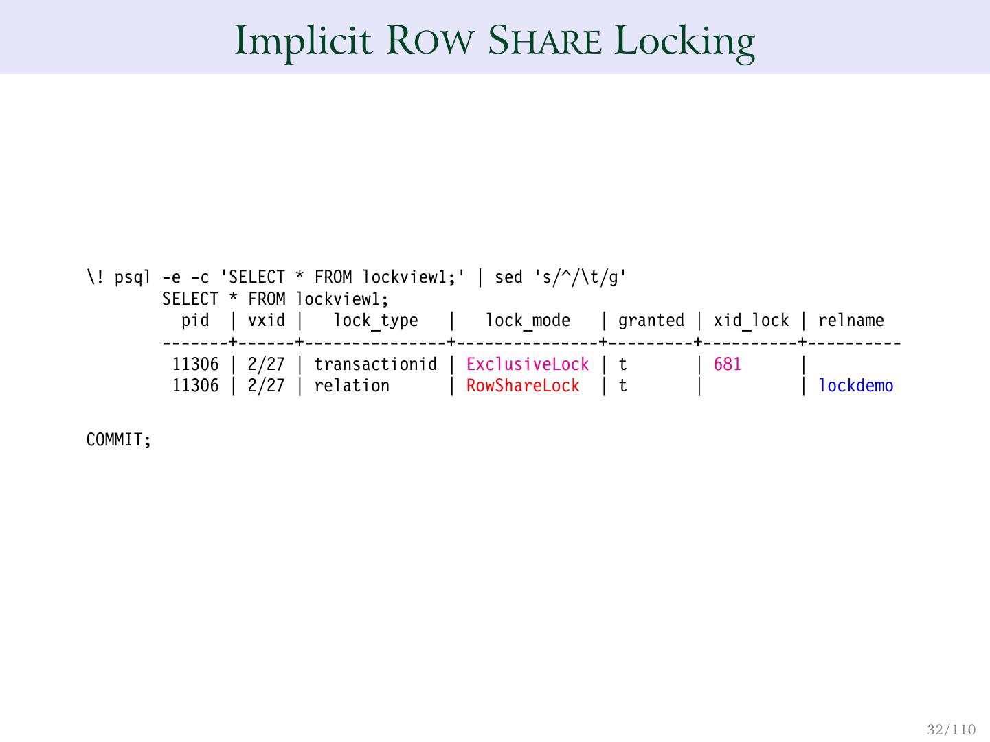 29 . Multi-Table ACCESS SHARE Locking \! psql -e -c ’SELECT * FROM lockview1;’ | sed ’s/^/\t/g’ SELECT * FROM lockview1; pid | vxid | lock_type | lock_mode | granted | xid_lock | relname -------+------+-----------+-----------------+---------+----------+--------------------------------- 11306 | 2/25 | relation | AccessShareLock | t | | pg_attribute 11306 | 2/25 | relation | AccessShareLock | t | | pg_attribute_relid_attnam_index 11306 | 2/25 | relation | AccessShareLock | t | | pg_attribute_relid_attnum_index 11306 | 2/25 | relation | AccessShareLock | t | | pg_class 11306 | 2/25 | relation | AccessShareLock | t | | pg_class_oid_index 11306 | 2/25 | relation | AccessShareLock | t | | pg_class_relname_nsp_index 11306 | 2/25 | relation | AccessShareLock | t | | pg_namespace 11306 | 2/25 | relation | AccessShareLock | t | | pg_namespace_nspname_index 11306 | 2/25 | relation | AccessShareLock | t | | pg_namespace_oid_index OMMIT; 29 / 110