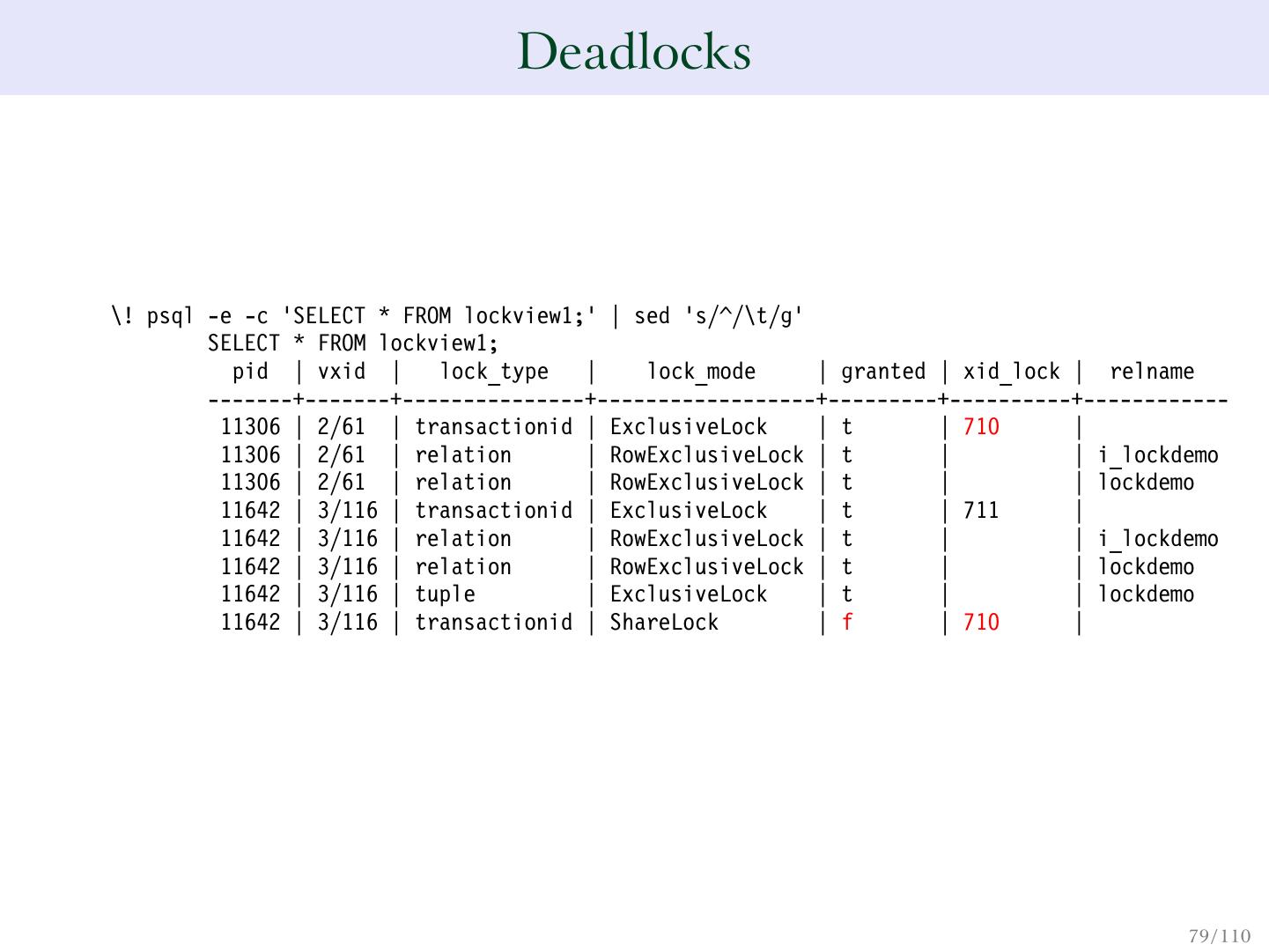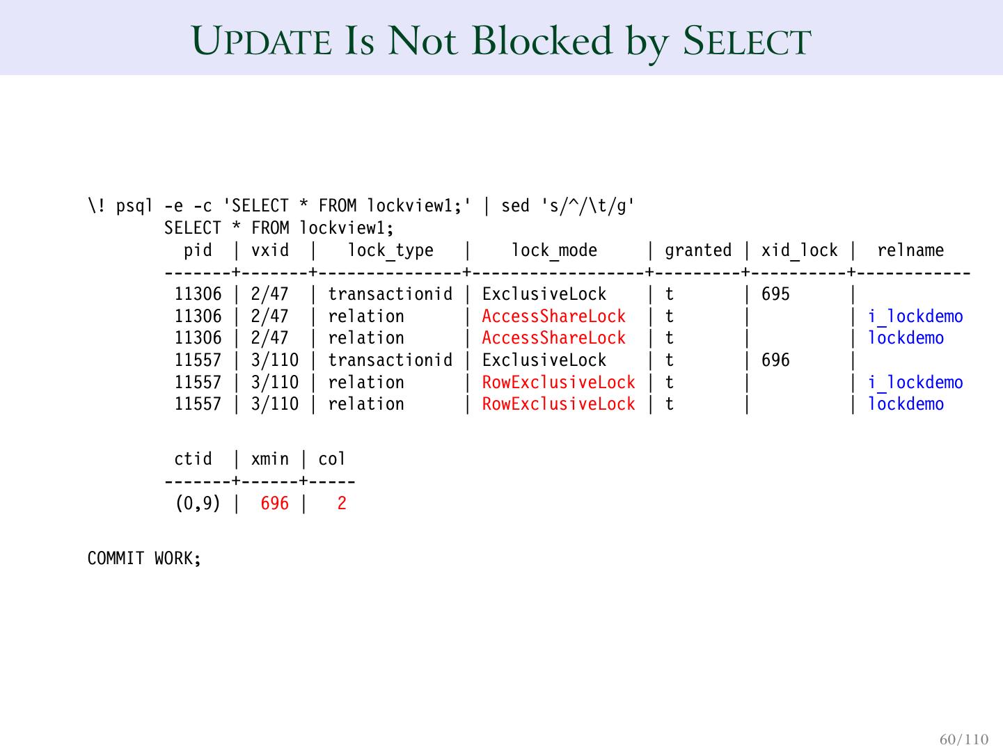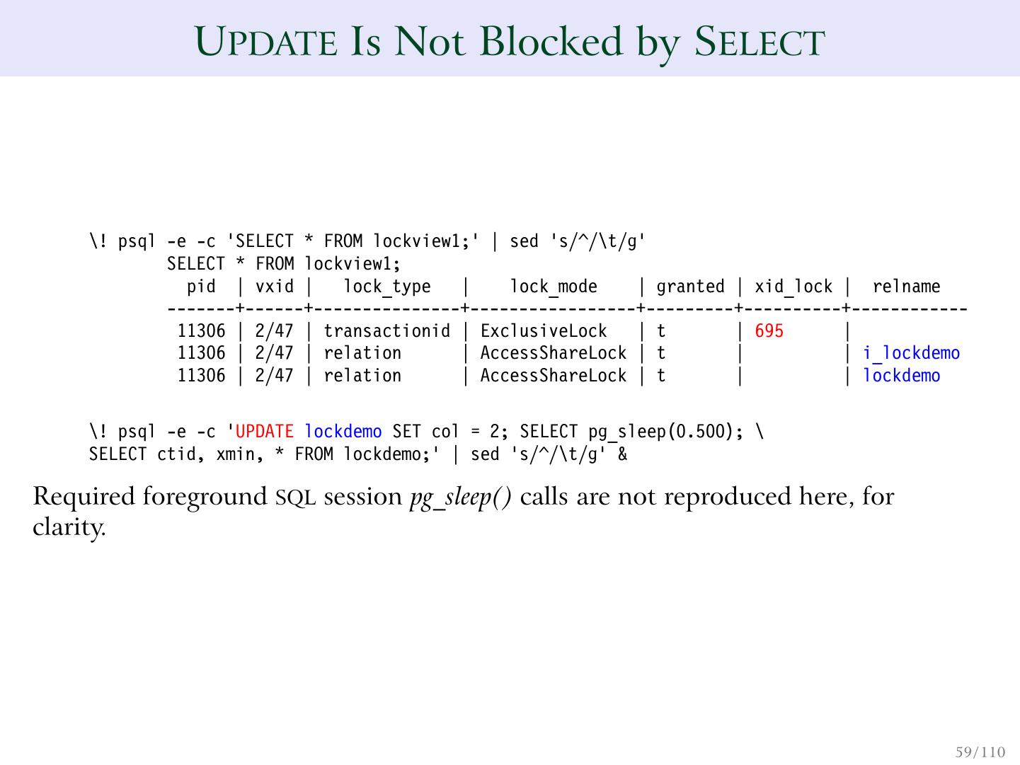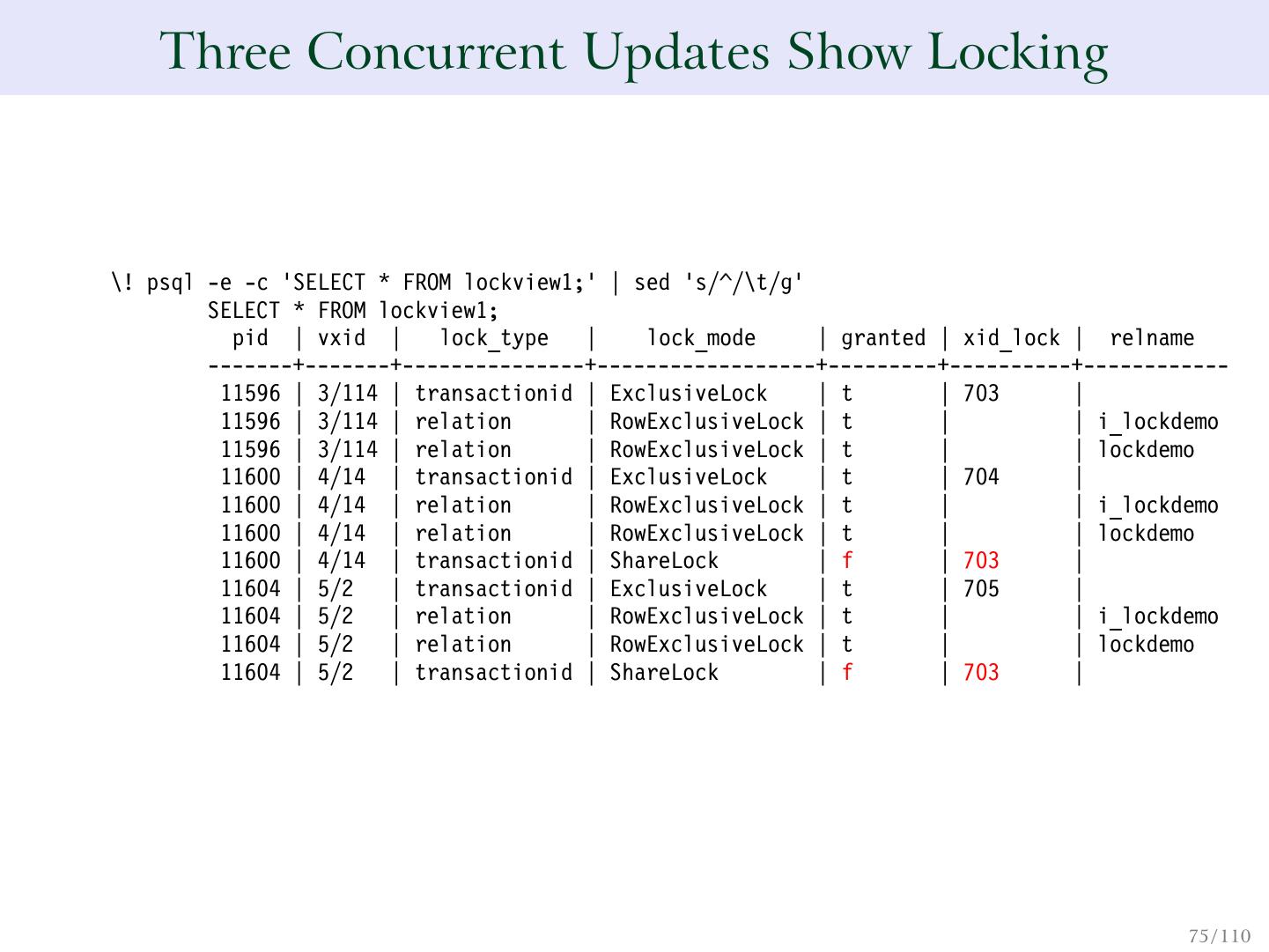 29 . Multi-Table ACCESS SHARE Locking \! psql -e -c ’SELECT * FROM lockview1;’ | sed ’s/^/\t/g’ SELECT * FROM lockview1; pid | vxid | lock_type | lock_mode | granted | xid_lock | relname -------+------+-----------+-----------------+---------+----------+--------------------------------- 11306 | 2/25 | relation | AccessShareLock | t | | pg_attribute 11306 | 2/25 | relation | AccessShareLock | t | | pg_attribute_relid_attnam_index 11306 | 2/25 | relation | AccessShareLock | t | | pg_attribute_relid_attnum_index 11306 | 2/25 | relation | AccessShareLock | t | | pg_class 11306 | 2/25 | relation | AccessShareLock | t | | pg_class_oid_index 11306 | 2/25 | relation | AccessShareLock | t | | pg_class_relname_nsp_index 11306 | 2/25 | relation | AccessShareLock | t | | pg_namespace 11306 | 2/25 | relation | AccessShareLock | t | | pg_namespace_nspname_index 11306 | 2/25 | relation | AccessShareLock | t | | pg_namespace_oid_index OMMIT; 29 / 110