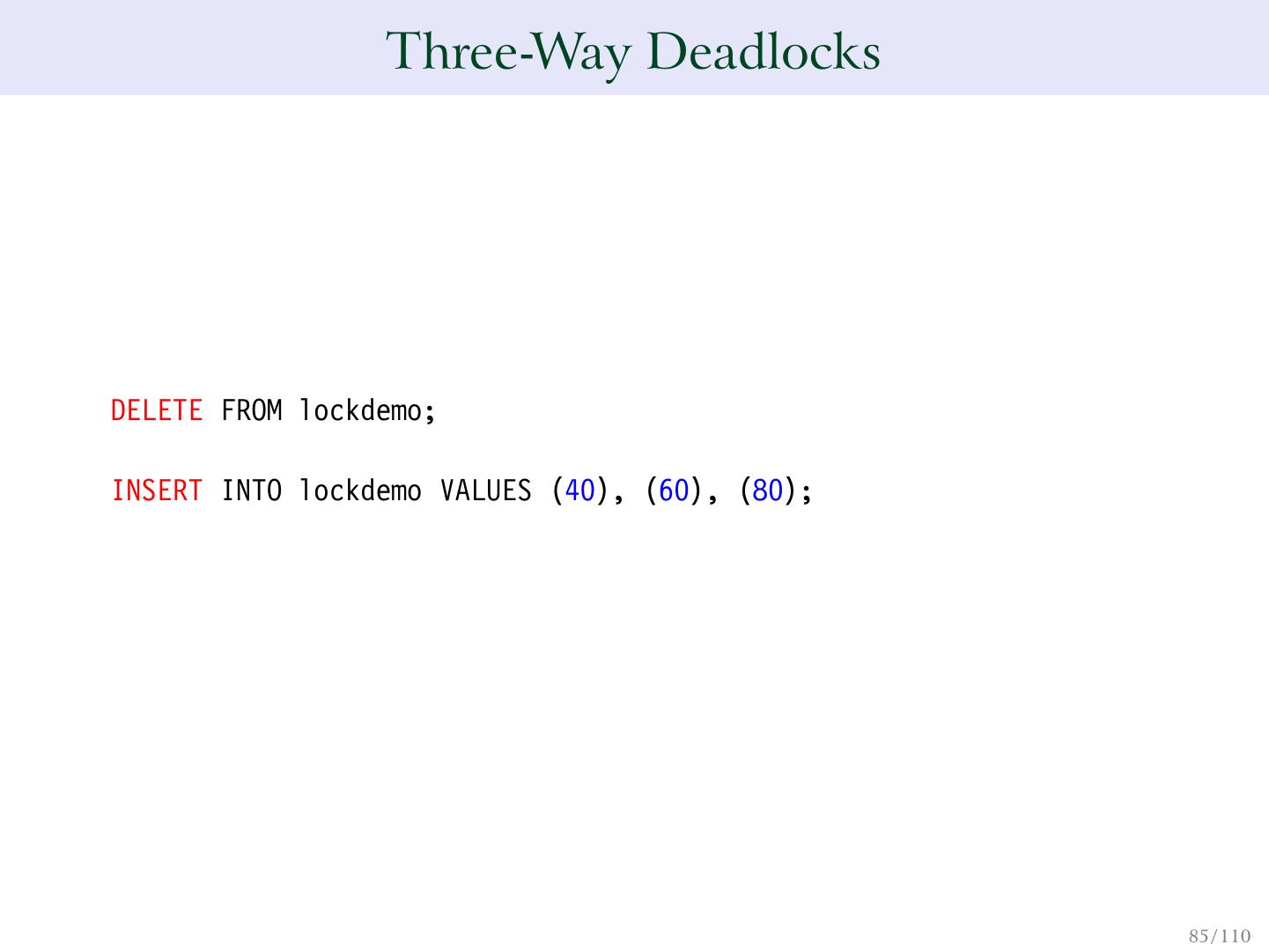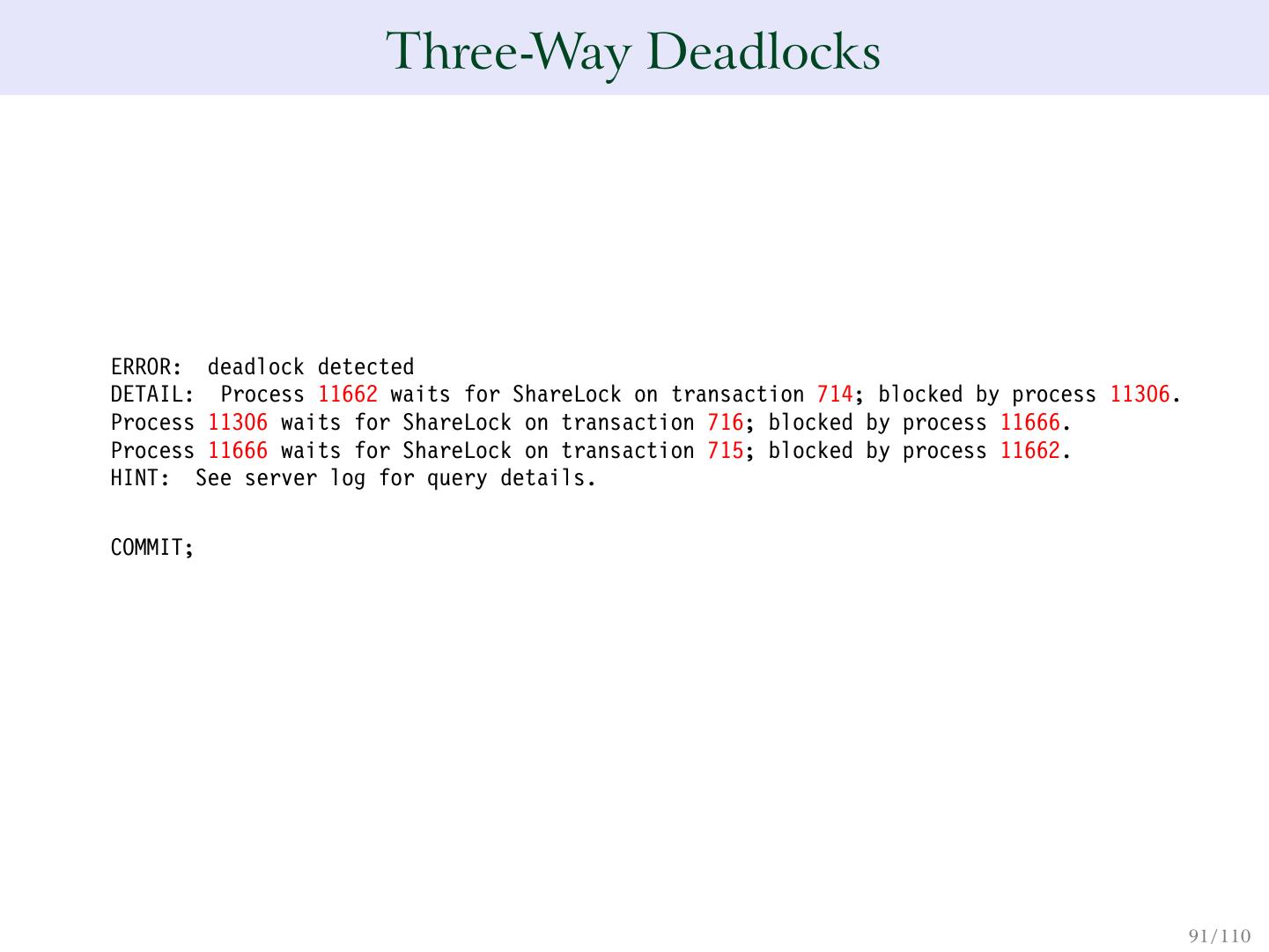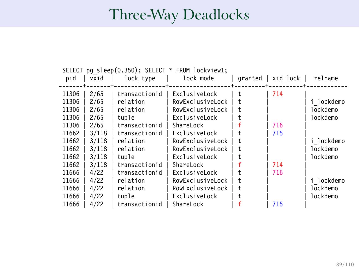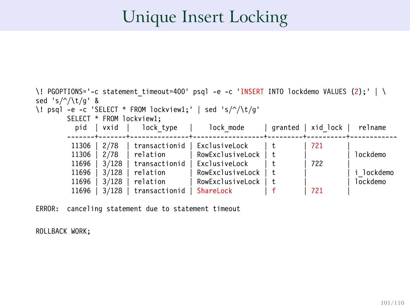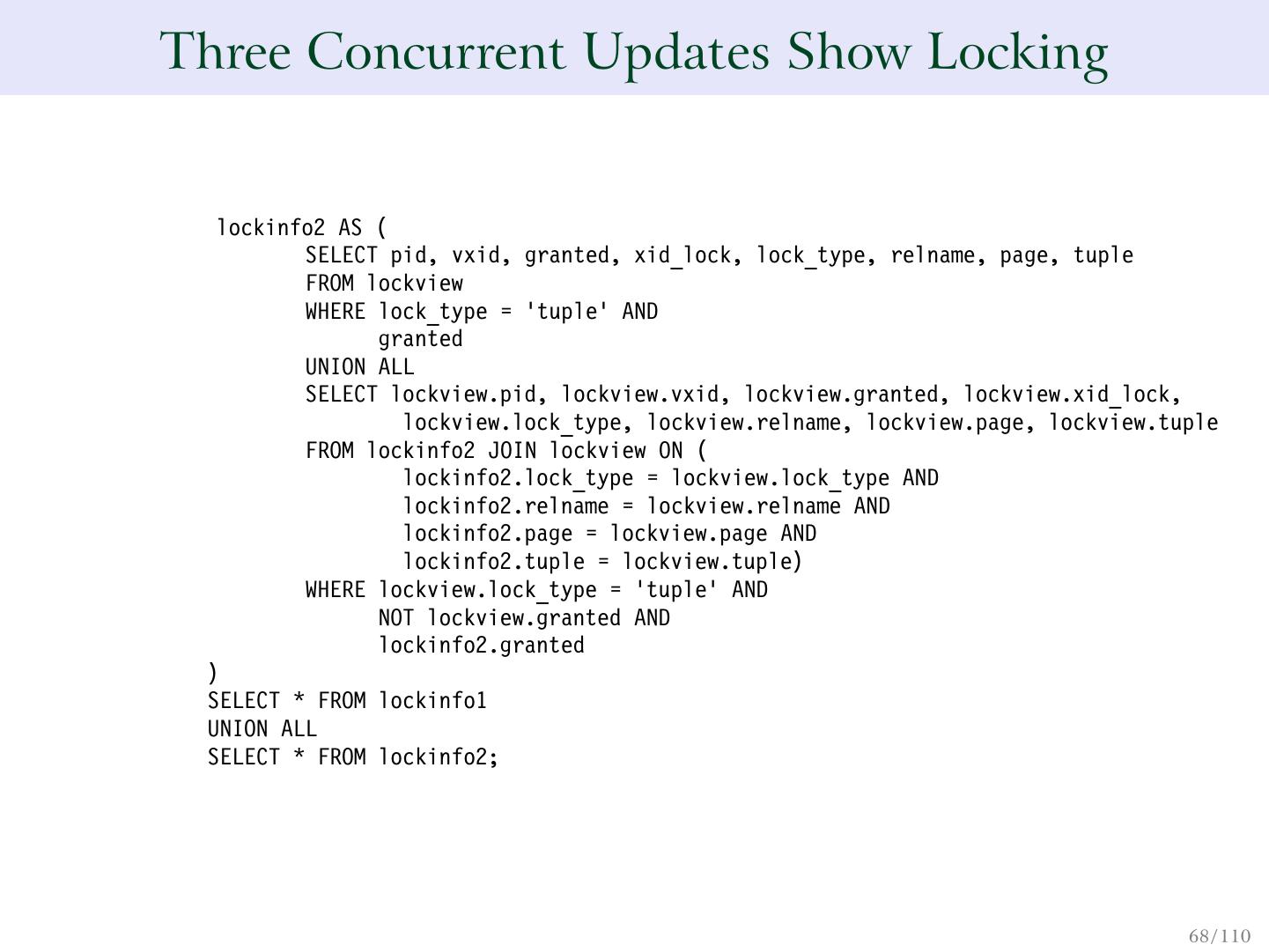 29 . Multi-Table ACCESS SHARE Locking \! psql -e -c ’SELECT * FROM lockview1;’ | sed ’s/^/\t/g’ SELECT * FROM lockview1; pid | vxid | lock_type | lock_mode | granted | xid_lock | relname -------+------+-----------+-----------------+---------+----------+--------------------------------- 11306 | 2/25 | relation | AccessShareLock | t | | pg_attribute 11306 | 2/25 | relation | AccessShareLock | t | | pg_attribute_relid_attnam_index 11306 | 2/25 | relation | AccessShareLock | t | | pg_attribute_relid_attnum_index 11306 | 2/25 | relation | AccessShareLock | t | | pg_class 11306 | 2/25 | relation | AccessShareLock | t | | pg_class_oid_index 11306 | 2/25 | relation | AccessShareLock | t | | pg_class_relname_nsp_index 11306 | 2/25 | relation | AccessShareLock | t | | pg_namespace 11306 | 2/25 | relation | AccessShareLock | t | | pg_namespace_nspname_index 11306 | 2/25 | relation | AccessShareLock | t | | pg_namespace_oid_index OMMIT; 29 / 110