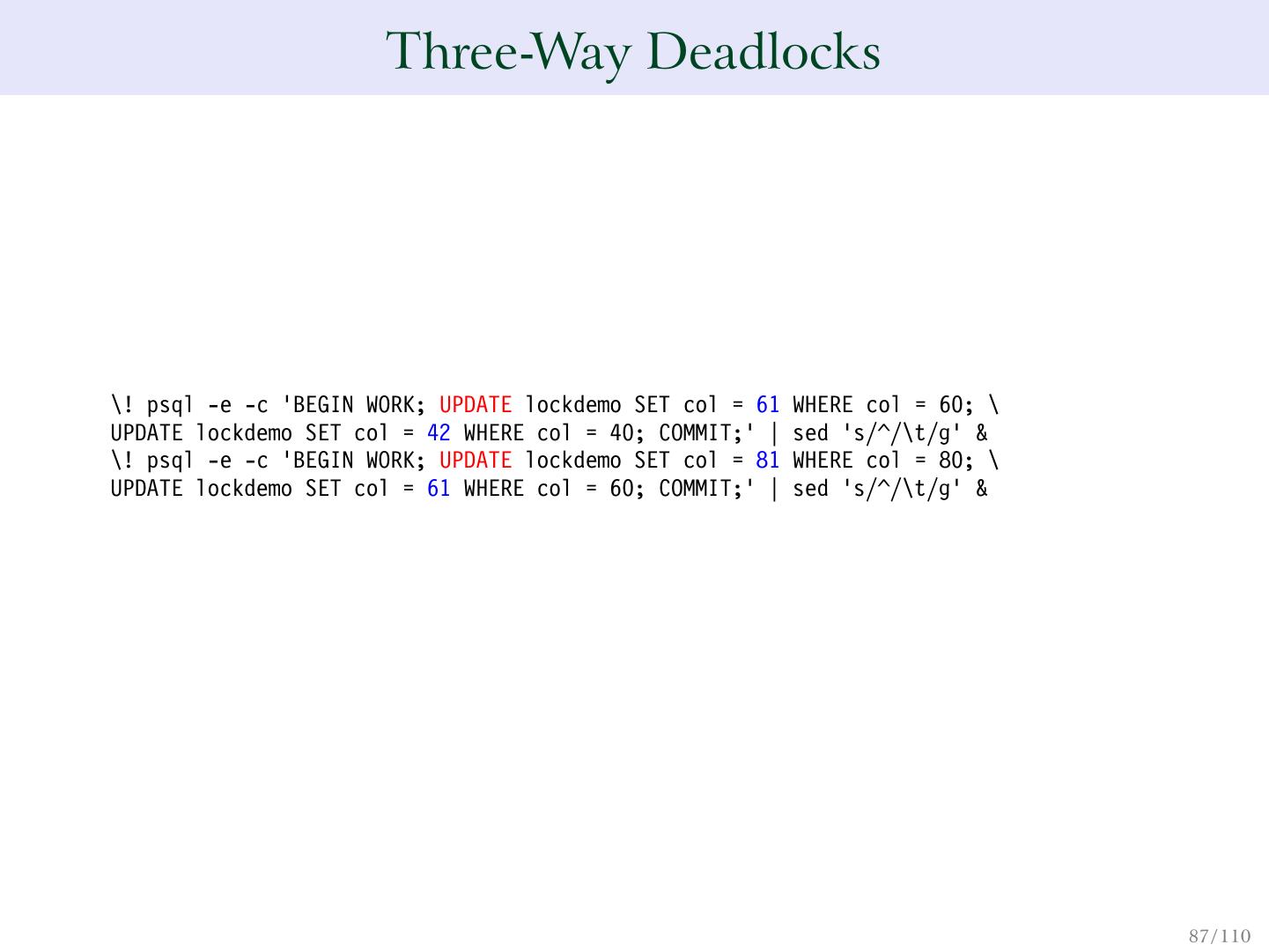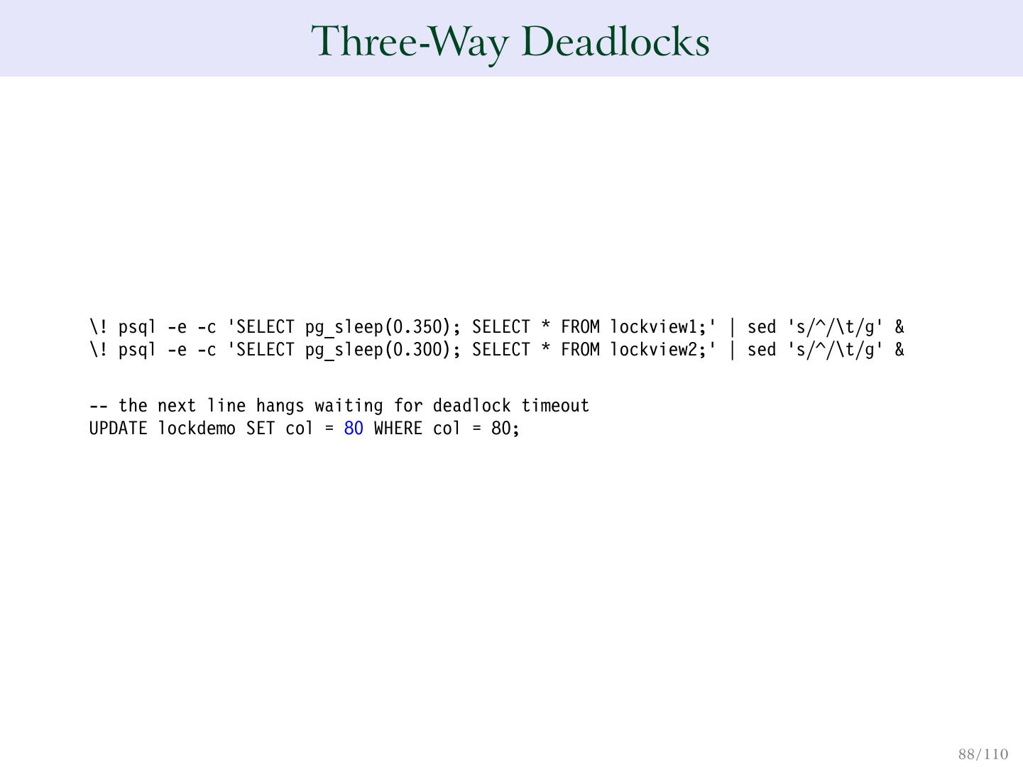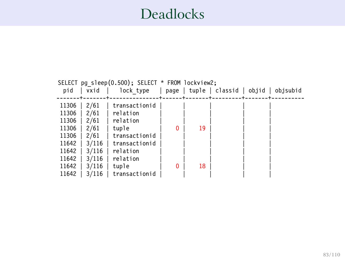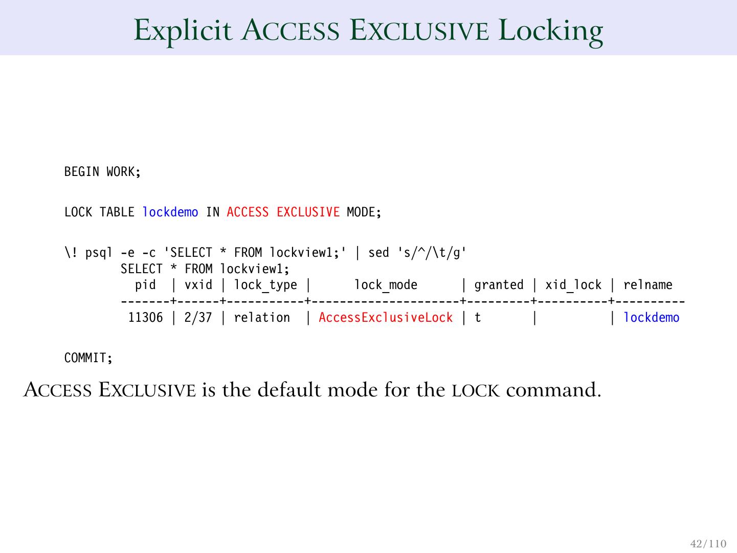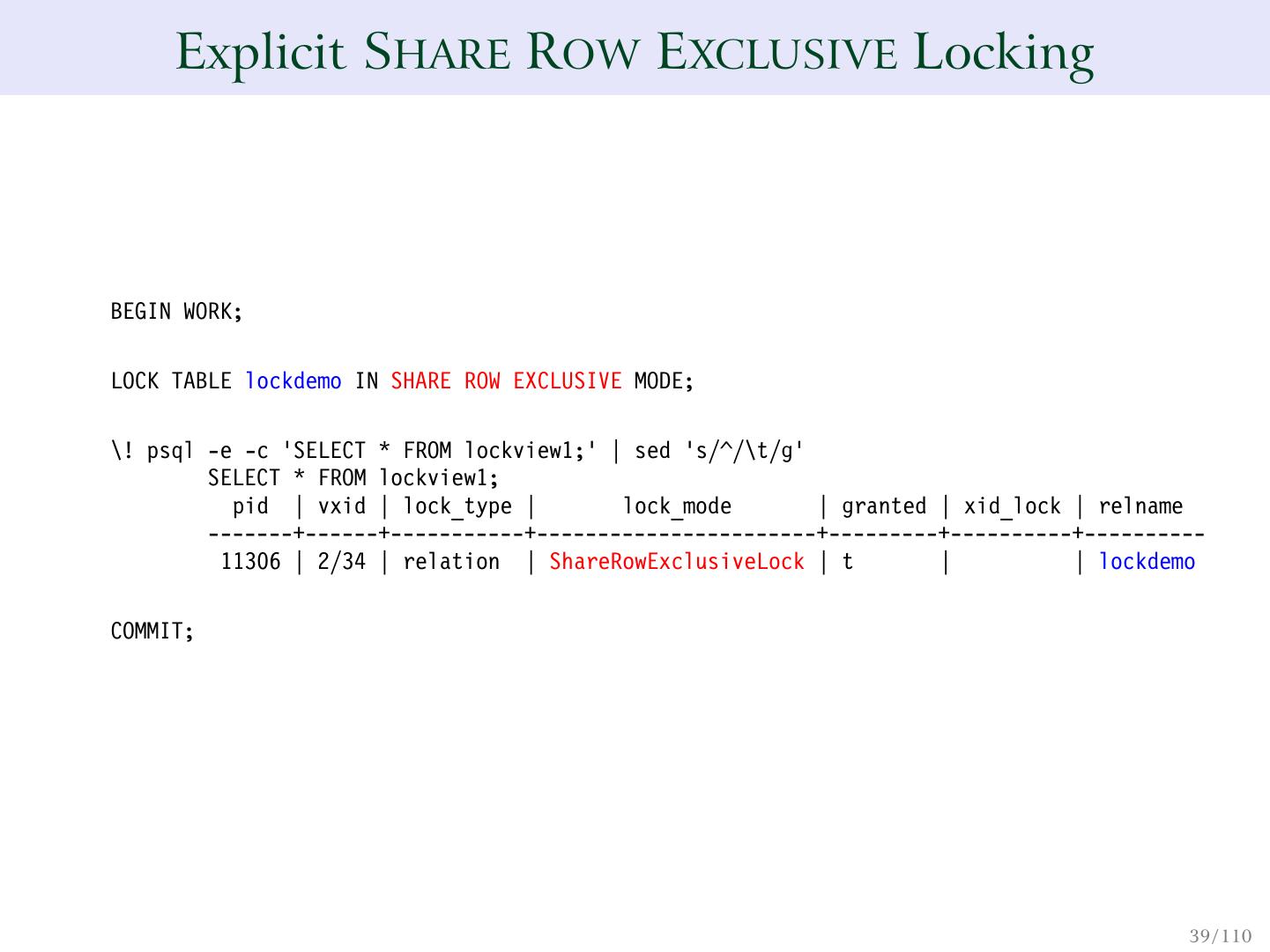 26 . Explicit ACCESS SHARE Locking \! psql -e -c ’SELECT * FROM lockview2;’ | sed ’s/^/\t/g’ SELECT * FROM lockview2; pid | vxid | lock_type | page | tuple | classid | objid | objsubid -------+------+-----------+------+-------+---------+-------+---------- 11306 | 2/23 | relation | | | | | COMMIT; Future slides will only show lockview2 if it contains useful information. 26 / 110