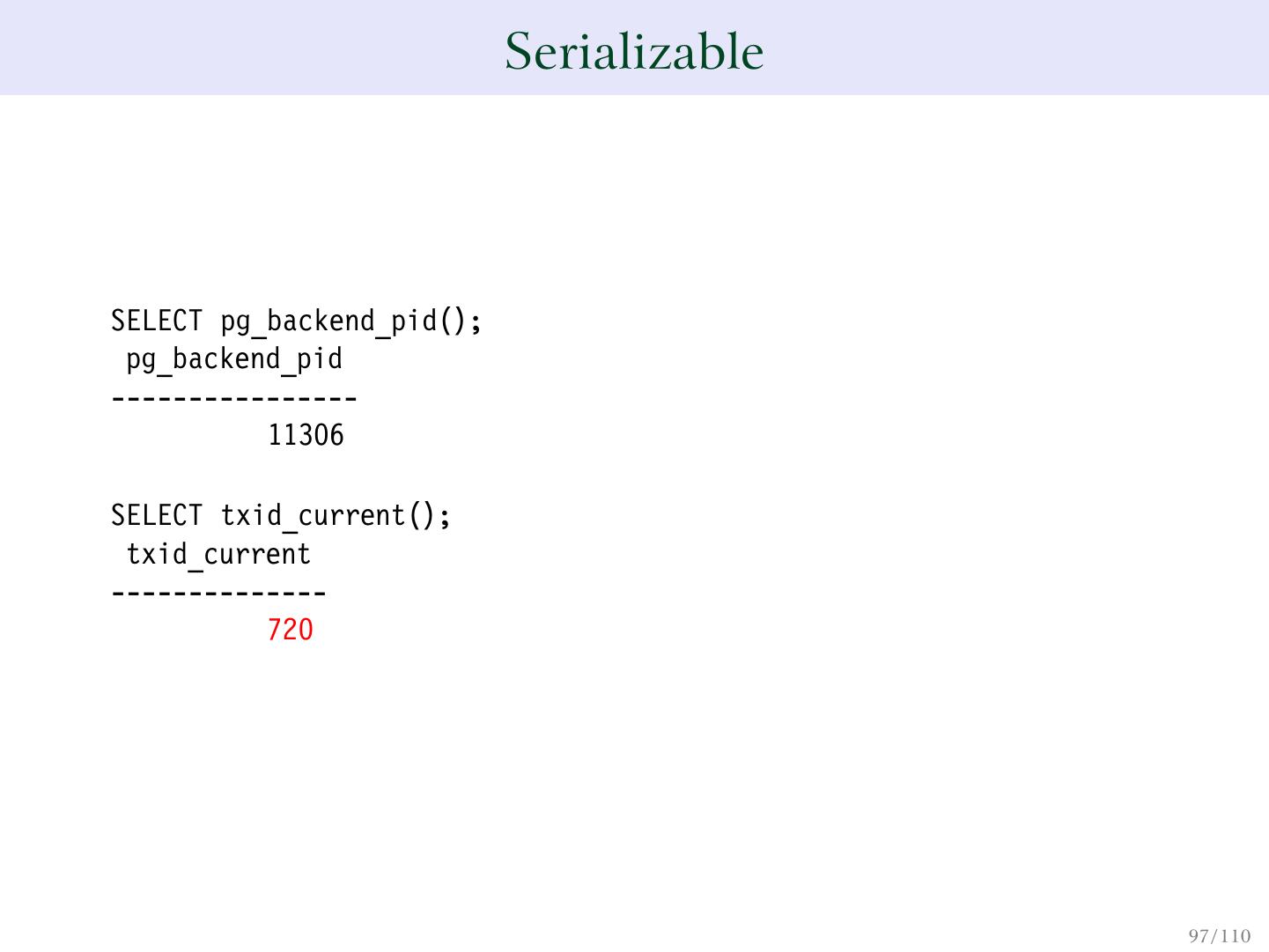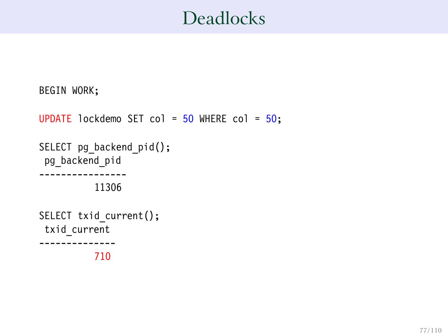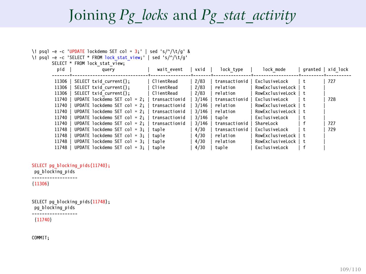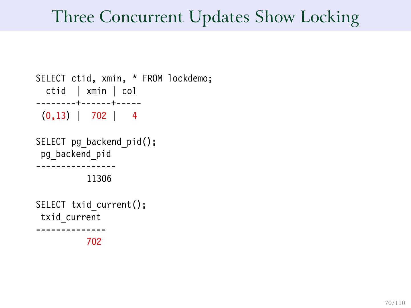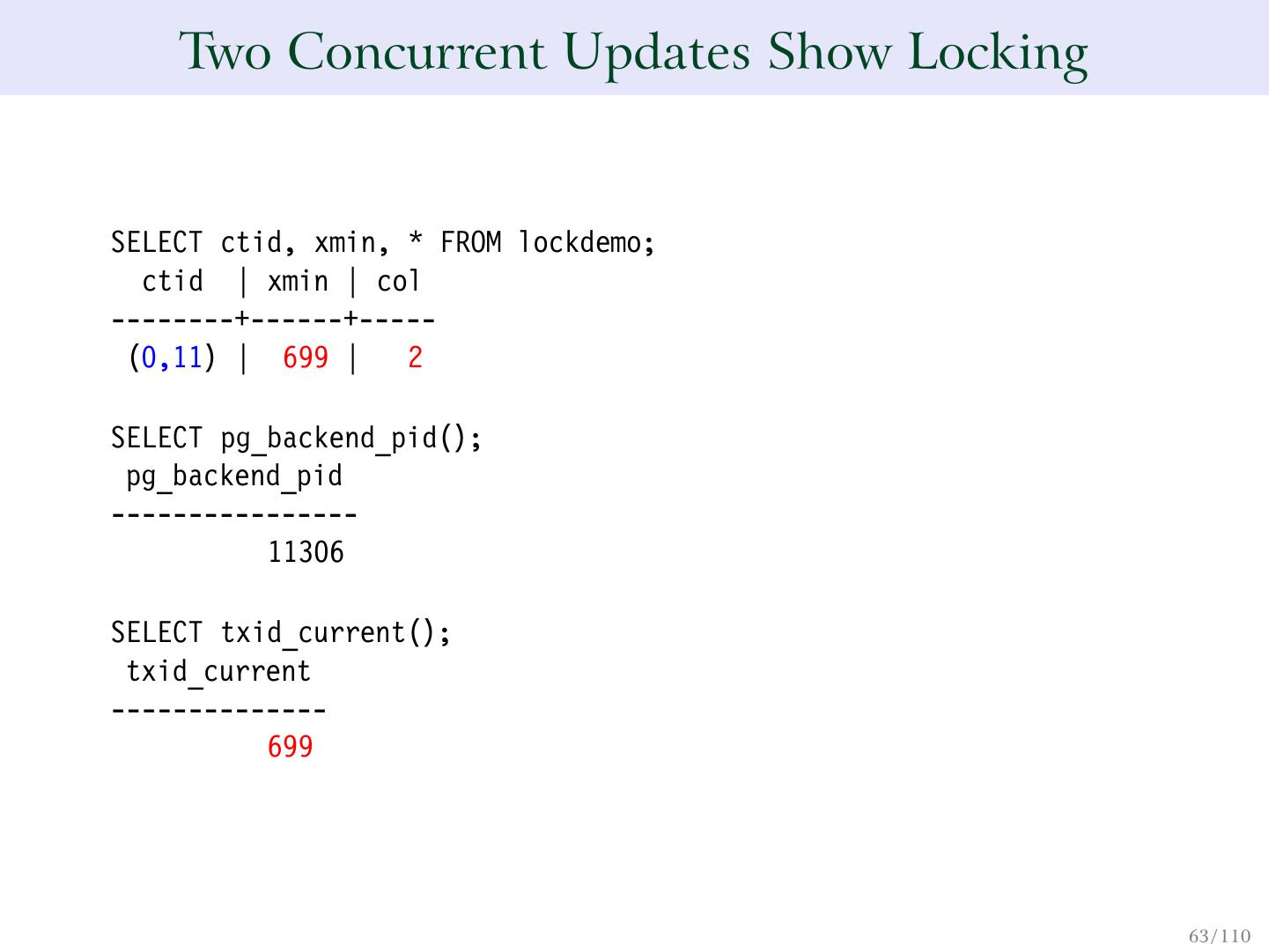 12 . What Is Our Process Identifier (PID)? SELECT pg_backend_pid(); pg_backend_pid ---------------- 11306 All queries used in this presentation are available at http://momjian. us/main/writings/pgsql/locking.sql. 12 / 110