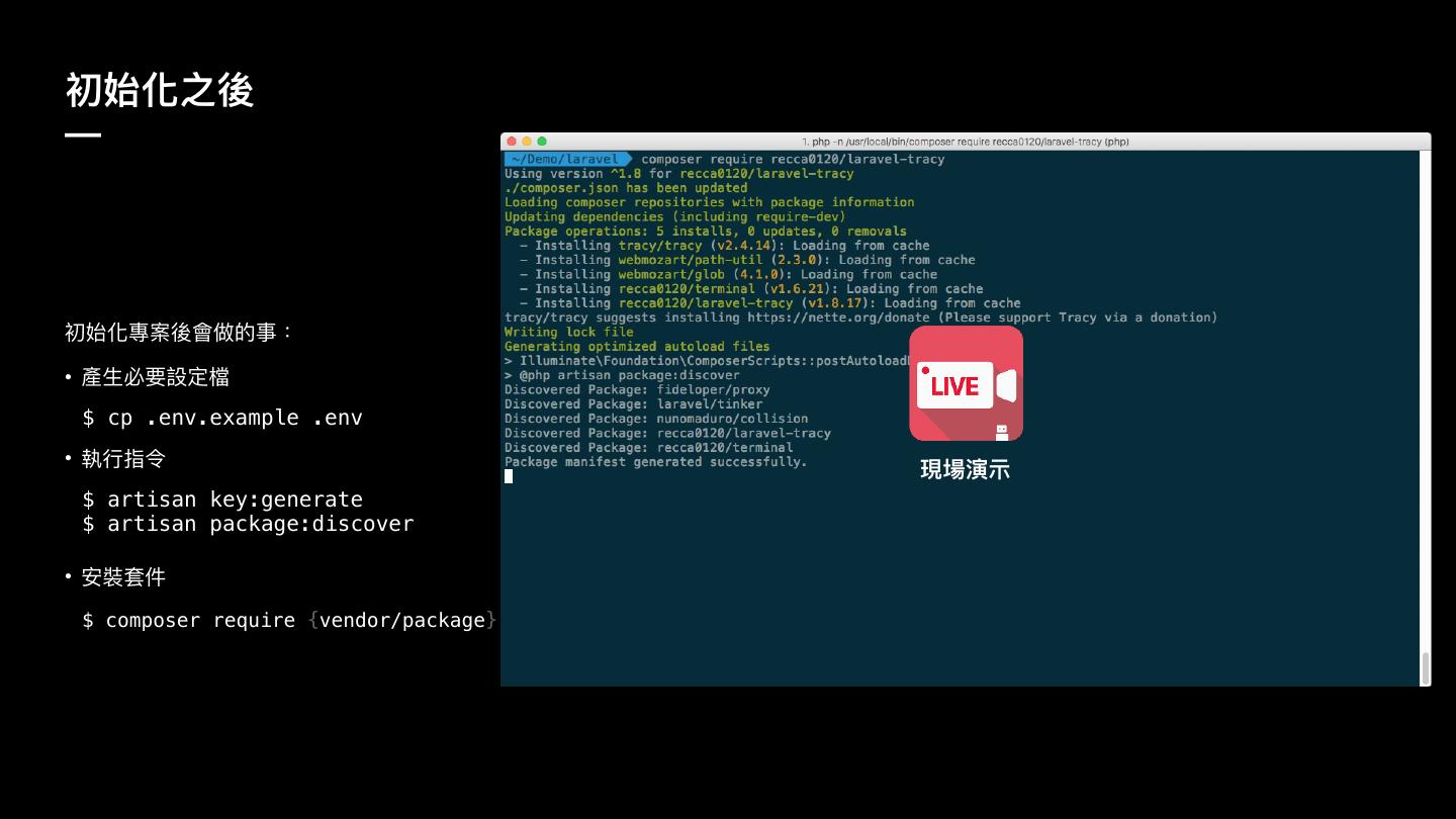 9 .ڡত玕ԏ盅 — ڡত玕䌕礯盅䨝狶ጱԪ物 • 叨ኞᥝ戔ਧ䲆 $ cp .env.example .env • 䁆ᤈ瞲犤 匍䁰ᄍ纈 $ artisan key:generate $ artisan package:discover • ਞ蕕ॺկ $ composer require {vendor/package}