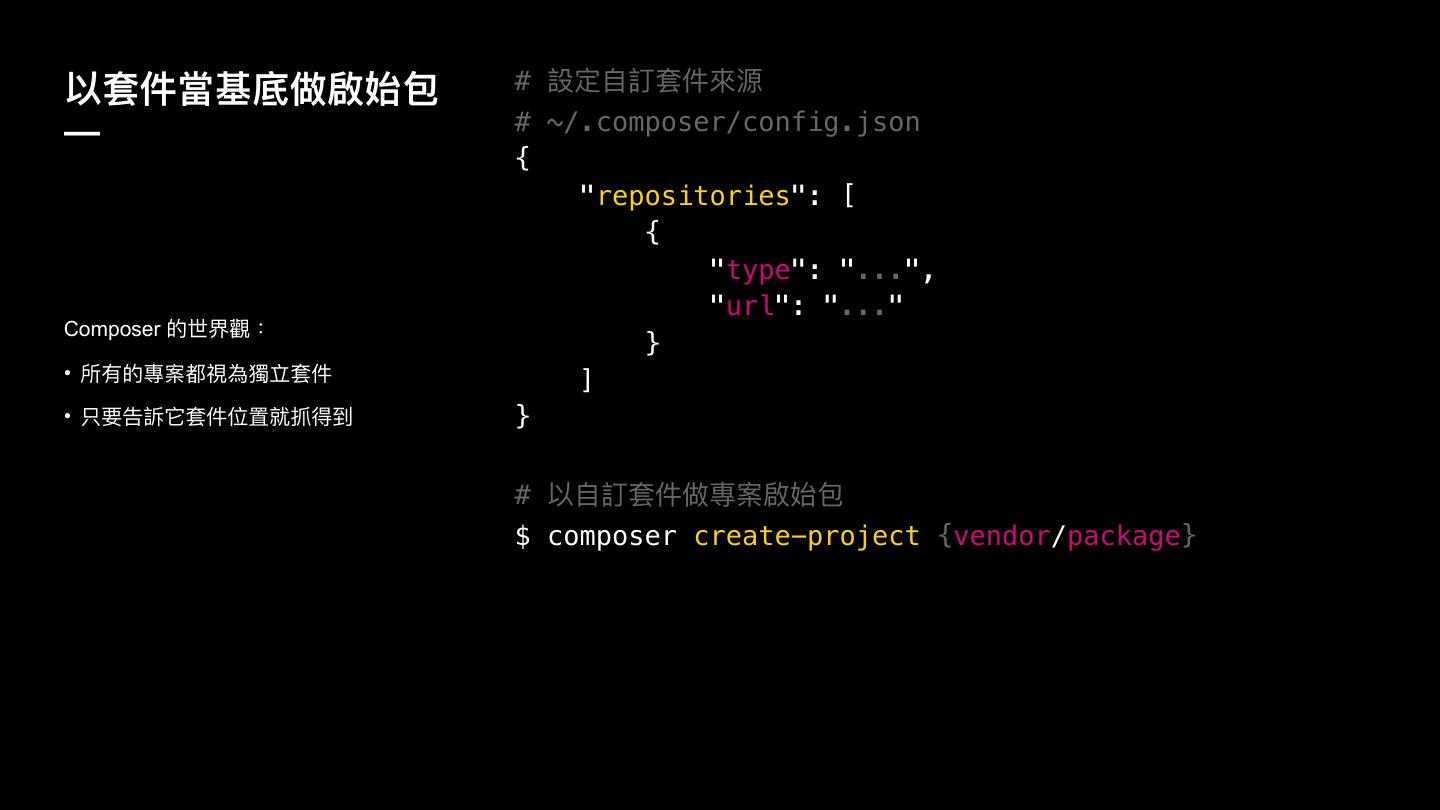 10 .犥ॺկ吚च皈狶珸ত۱ # 戔ਧᛔ懪ॺկ㬵რ — # ~/.composer/config.json { "repositories": [ { "type": "...", "url": "..." Composer ጱӮኴ薪物 } • ಅ磪ጱ䌕礯᮷憙傶加缏ॺկ ] • ݝᥝޞ藗ਙॺկ֖ᗝ疰瞟ک } # 犥ᛔ懪ॺկ狶䌕礯珸ত۱ $ composer create-project {vendor/package}