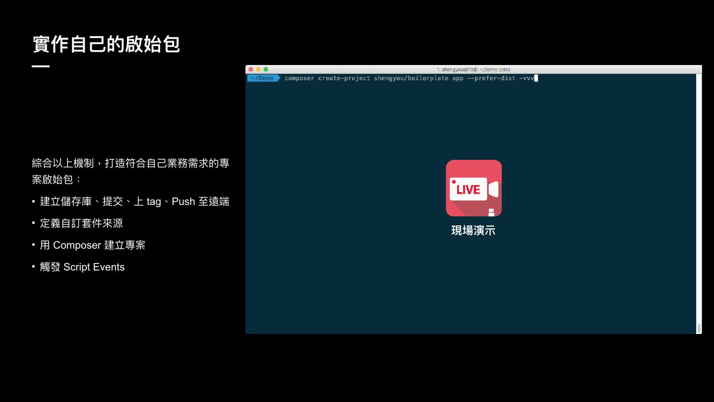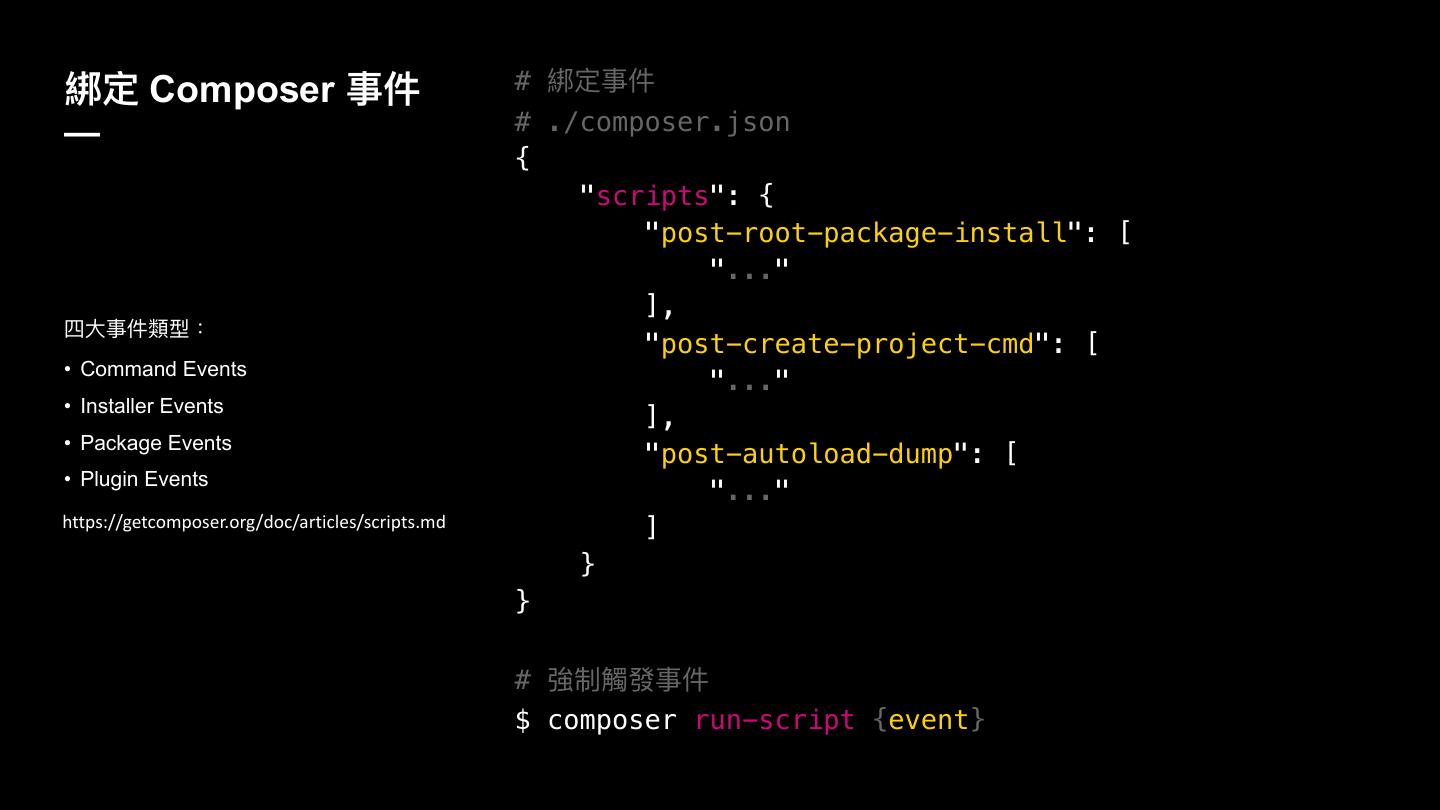 11 .翉ਧ Composer Ԫկ # 翉ਧԪկ — # ./composer.json { "scripts": { "post-root-package-install": [ "..." ], ࢥय़Ԫկ觊ࣳ物 "post-create-project-cmd": [ • Command Events "..." • Installer Events ], • Package Events "post-autoload-dump": [ • Plugin Events "..." https://getcomposer.org/doc/articles/scripts.md ] } } # 䔶ګ藉咳Ԫկ $ composer run-script {event}