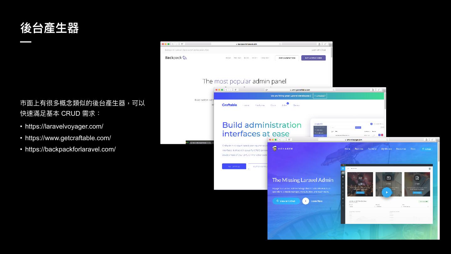17 .盅ݣ叨ኞ瑊 — ૱ᶎӤ磪盄ग़禊盢觊犲ጱ盅ݣ叨ኞ瑊牧ݢ犥 盠蝧笕᪃च CRUD 襑穩物 • https://laravelvoyager.com/ • https://www.getcraftable.com/ • https://backpackforlaravel.com/