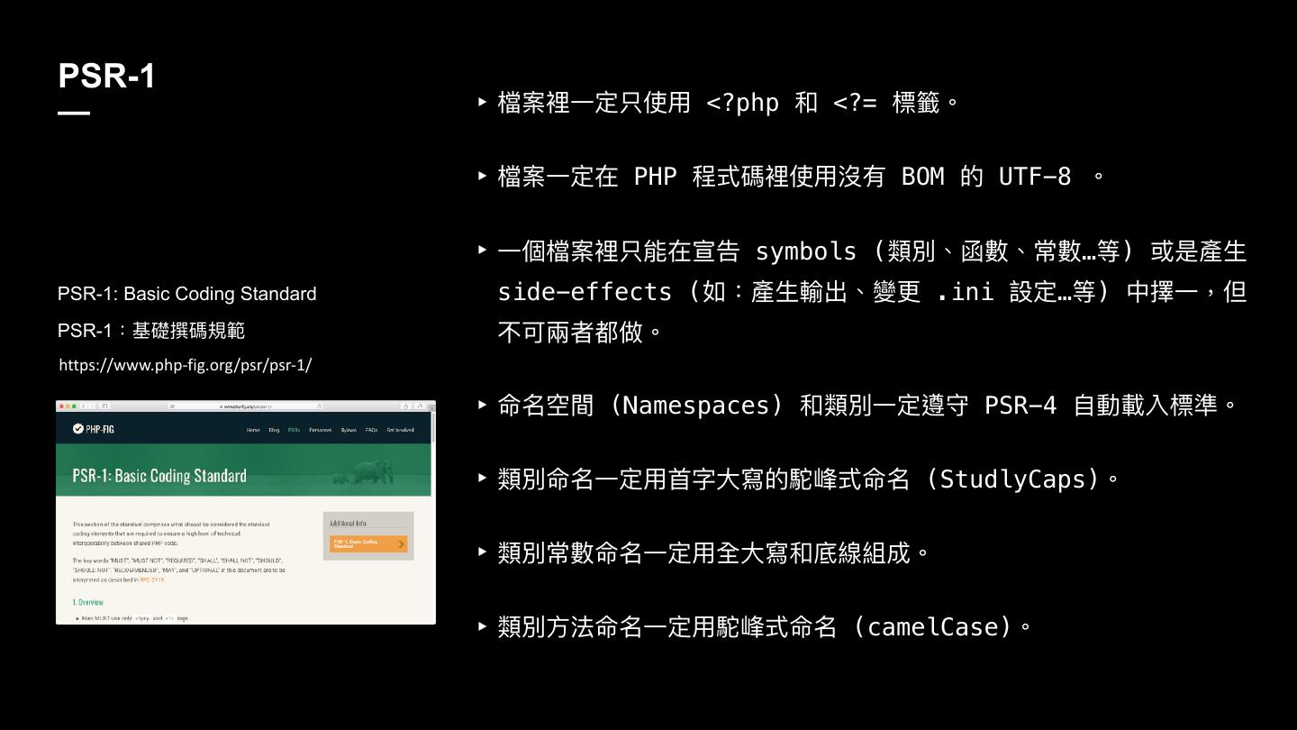 24 .PSR-1 — ‣ 䲆礯愊Ӟਧֵݝአ <?php <?= 秂壆牐 ‣ 䲆礯Ӟਧࣁ PHP 纷ୗ嘨愊ֵአ䷱磪 BOM ጱ UTF-8 牐 ‣ Ӟ㮆䲆礯愊ݝ胼ࣁਯ ޞsymbols (觊獨牏獢碍牏ଉ碍…缛) ฎ叨ኞ PSR-1: Basic Coding Standard side-effects (ই物叨ኞ蜍ڊ牏虋ๅ .ini 戔ਧ…缛) Ӿ䢔Ӟ牧֕ PSR-1物च器砰嘨憒塅 犋ݢ獋ᘏ᮷狶牐 https://www.php-fig.org/psr/psr-1/ ‣ ݷ绚樌 (Namespaces) 觊獨Ӟਧ螞ਝ PSR-4 ᛔ㵕斉獈秂伛牐 ‣ 觊獨ݷӞਧአḒਁय़䌃ጱ洨痷ୗ( ݷStudlyCaps)牐 ‣ 觊獨ଉ碍ݷӞਧአ獊य़䌃皈娄奲౮牐 ‣ 觊獨ොဩݷӞਧአ洨痷ୗ( ݷcamelCase)牐