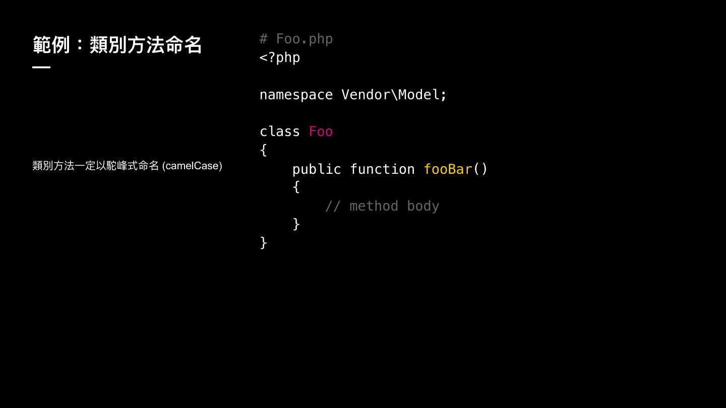 25 . # Foo.php 塅ֺ物觊獨ොဩݷ <?php — namespace Vendor\Model; class Foo { 觊獨ොဩӞਧ犥洨痷ୗ( ݷcamelCase) public function fooBar() { // method body } }