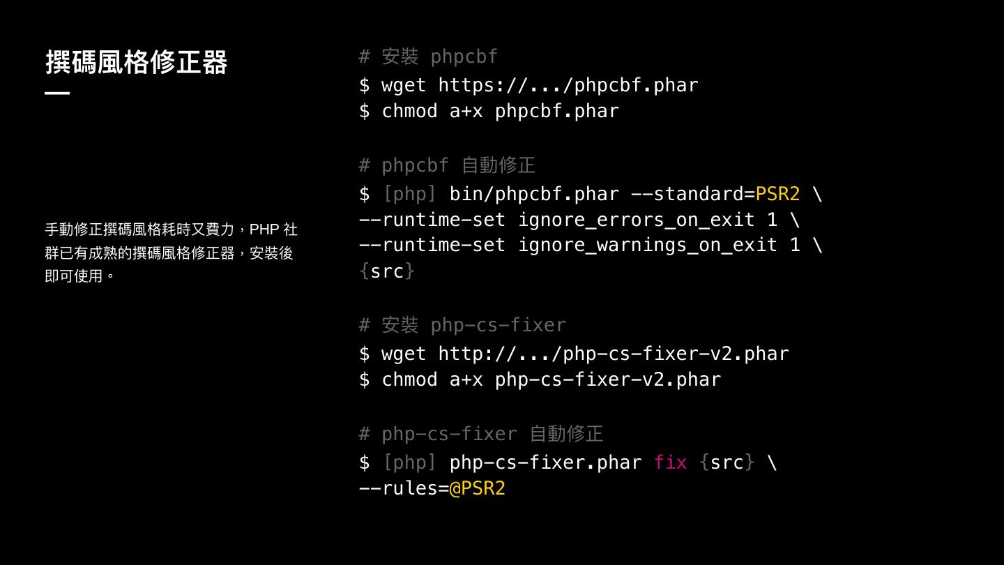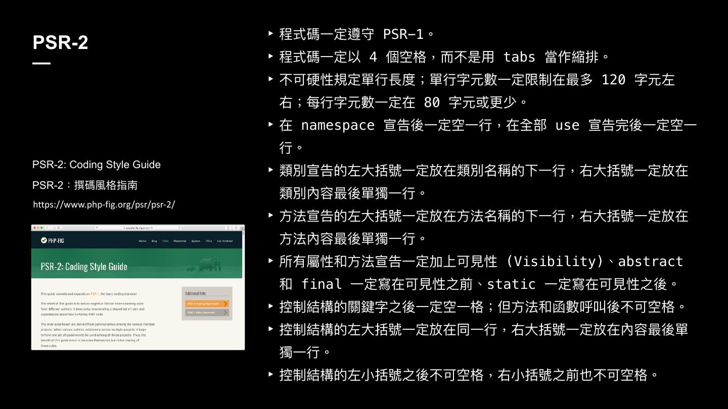 26 . ‣ 纷ୗ嘨Ӟਧ螞ਝ PSR-1牐 PSR-2 ‣ 纷ୗ嘨Ӟਧ犥 4 㮆绚໒牧ᘒ犋ฎአ tabs 吚֢婘矎牐 — ‣ 犋ݢᏝ憒ਧ㻌ᤈ裾ଶ牪㻌ᤈਁز碍Ӟਧ褖ࣁګ磧ग़ 120 ਁૢز ݦ牪ྯᤈਁز碍Ӟਧࣁ 80 ਁزๅ牐 ‣ ࣁ namespace ਯޞ盅Ӟਧ绚Ӟᤈ牧ࣁ獊蟂 use ਯޞਠ盅Ӟਧ绚Ӟ ᤈ牐 PSR-2: Coding Style Guide ‣ 觊獨ਯޞጱૢय़ೡ蒈Ӟਧ硯ࣁ觊獨ݷ圸ጱӥӞᤈ牧ݦय़ೡ蒈Ӟਧ硯ࣁ PSR-2物砰嘨觓໒瞲ܖ 觊獨獉磧盅㻌加Ӟᤈ牐 https://www.php-fig.org/psr/psr-2/ ‣ ොဩਯޞጱૢय़ೡ蒈Ӟਧ硯ࣁොဩݷ圸ጱӥӞᤈ牧ݦय़ೡ蒈Ӟਧ硯ࣁ ොဩ獉磧盅㻌加Ӟᤈ牐 ‣ ಅ磪痀ොဩਯޞӞਧےӤݢ憎 (Visibility)牏abstract final Ӟਧ䌃ࣁݢ憎ԏ獮牏static Ӟਧ䌃ࣁݢ憎ԏ盅牐 ‣ 矒ګ奾䯤ጱ橕棎ਁԏ盅Ӟਧ绚Ӟ໒牪֕ොဩ獢碍ݞ盅犋ݢ绚໒牐 ‣ 矒ګ奾䯤ጱૢय़ೡ蒈Ӟਧ硯ࣁݶӞᤈ牧ݦय़ೡ蒈Ӟਧ硯ࣁ獉磧盅㻌 加Ӟᤈ牐 ‣ 矒ګ奾䯤ጱૢੜೡ蒈ԏ盅犋ݢ绚໒牧ݦੜೡ蒈ԏ獮犖犋ݢ绚໒牐
