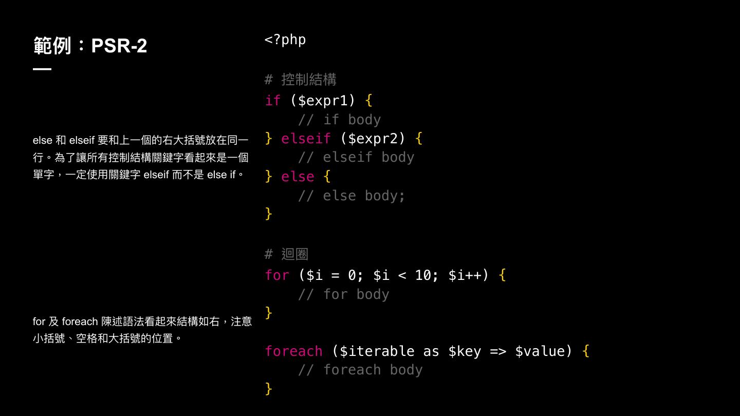 27 . <?php 塅ֺ物PSR-2 — # 矒ګ奾䯤 if ($expr1) { // if body else elseif ᥝӤӞ㮆ጱݦय़ೡ蒈硯ࣁݶӞ } elseif ($expr2) { ᤈ牐傶ԧ虏ಅ磪矒ګ奾䯤橕棎ਁ፡蚏㬵ฎӞ㮆 // elseif body 㻌ਁ牧Ӟਧֵአ橕棎ਁ elseif ᘒ犋ฎ else if牐 } else { // else body; } # 蝅瑹 for ($i = 0; $i < 10; $i++) { // for body } for 现 foreach 檔蝄承ဩ፡蚏㬵奾䯤ইݦ牧ဳ ੜೡ蒈牏绚໒य़ೡ蒈ጱ֖ᗝ牐 foreach ($iterable as $key => $value) { // foreach body }