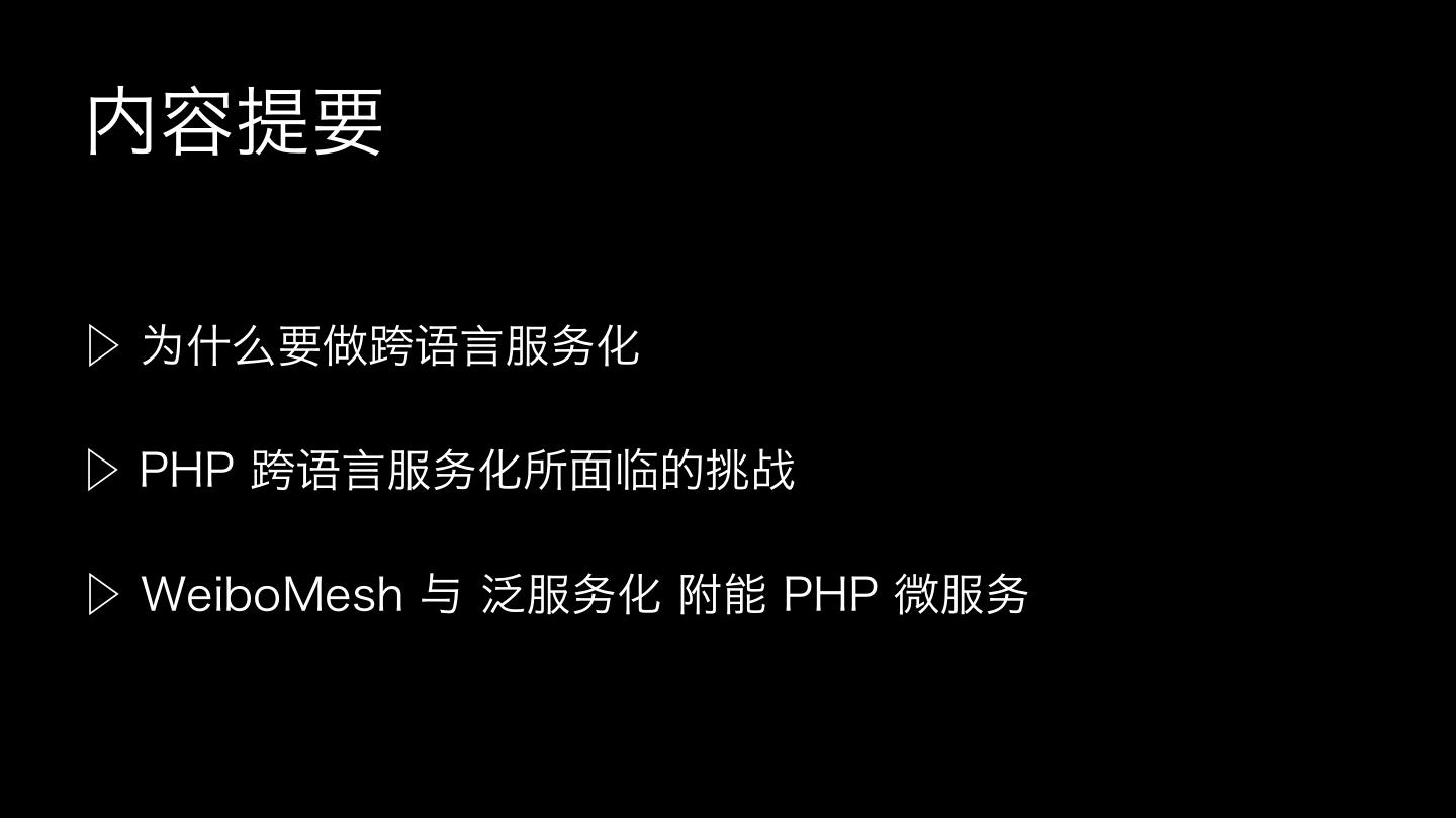 2 .内容提要 ▷ 为什么要做跨语言服务化 ▷ PHP 跨语言服务化所面临的挑战 ▷ WeiboMesh 与 泛服务化 附能 PHP 微服务