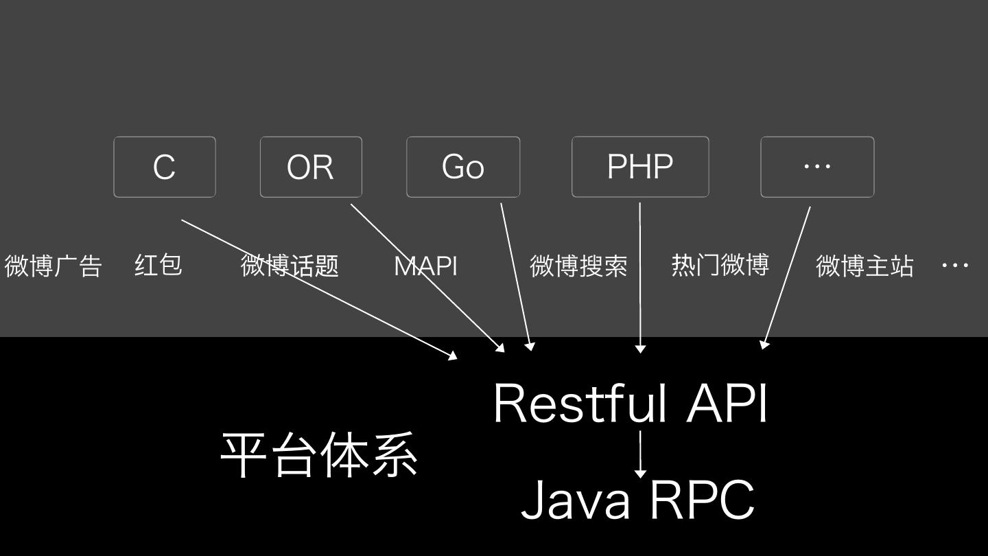 8 . C OR Go PHP … 微博广告 ᕁ包 微博ᦾ᷌ MAPI 微博搜索 ᅾ门微博 微博主站 … Restful API 平台体系 Java RPC