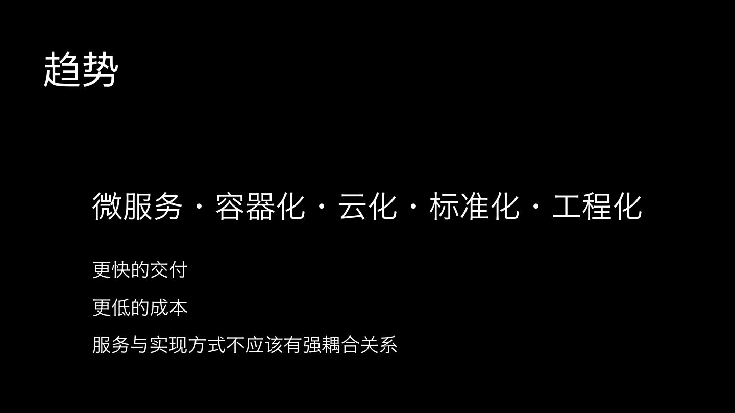 9 .۠ 微服务·容器化·云化·标准化·工程化 更快的交付 更低的成本 服务与实现方式不应该有强耦合关系