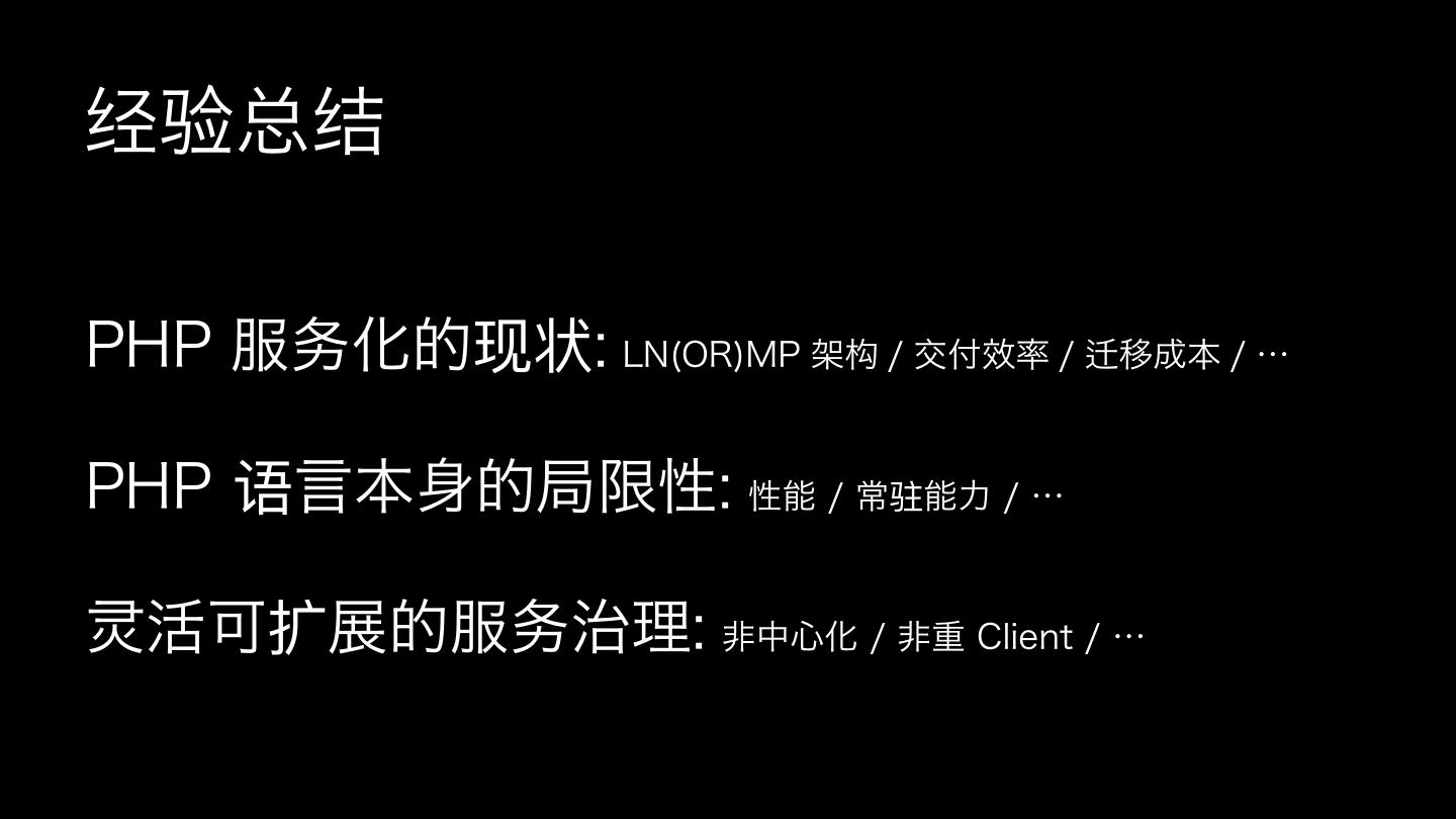 14 .经验总结 PHP 服务化的ሿᇫ: LN(OR)MP 架构 / 交付效率 / 迁移成本 / … PHP 言本身的局限性: 性能 / 常Ḧ能力 / … 灵活可ಘ展的服务治理: 非中心化 / 非重 Client / …