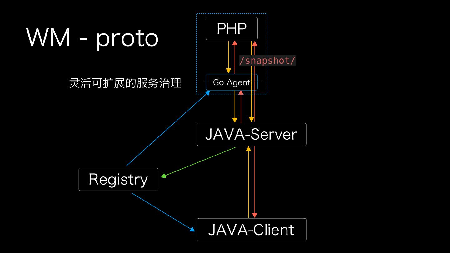 21 . PHP WM - proto /snapshot/ 灵活可ಘ展的服务治理 Go Agent JAVA-Server Registry JAVA-Client