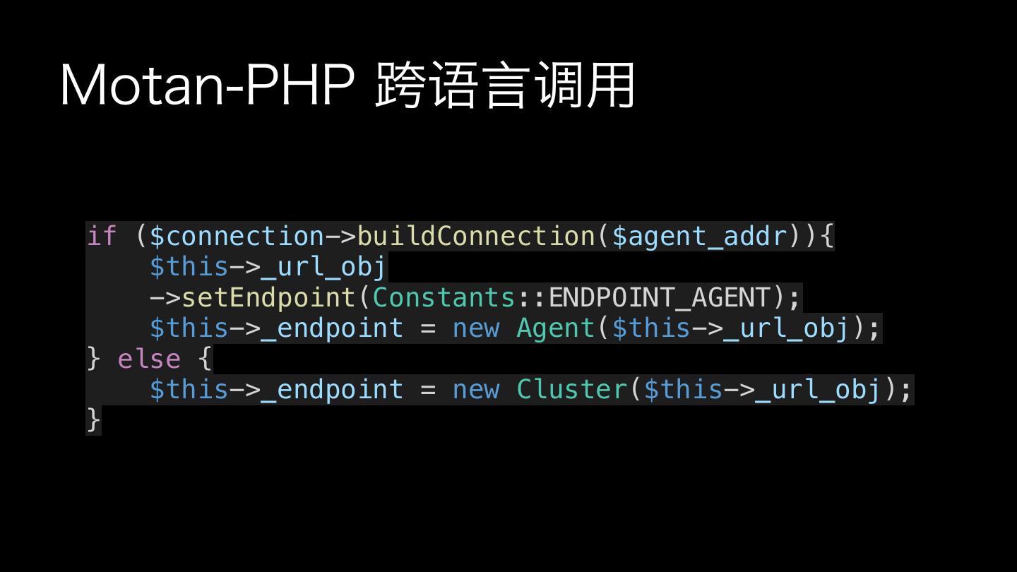 22 .Motan-PHP 跨语言调用 if ($connection->buildConnection($agent_addr)){ $this->_url_obj ->setEndpoint(Constants::ENDPOINT_AGENT); $this->_endpoint = new Agent($this->_url_obj); } else { $this->_endpoint = new Cluster($this->_url_obj); }