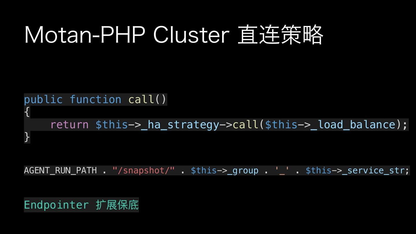 23 .Motan-PHP Cluster 直连策略 public function call() { return $this->_ha_strategy->call($this->_load_balance); } AGENT_RUN_PATH . "/snapshot/" . $this->_group . '_' . $this->_service_str; Endpointer ಘכବ