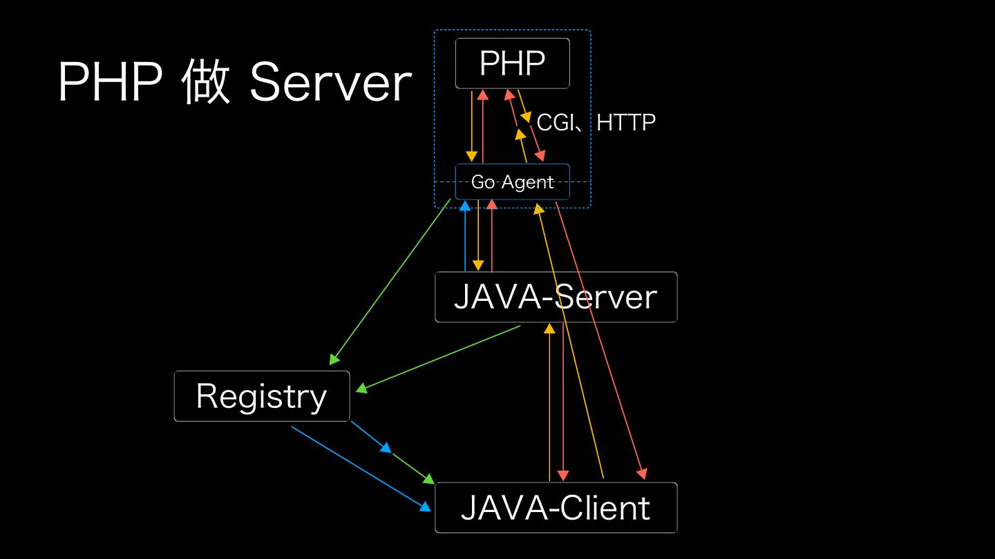 24 . PHP PHP 做 Server CGI、HTTP Go Agent JAVA-Server Registry JAVA-Client