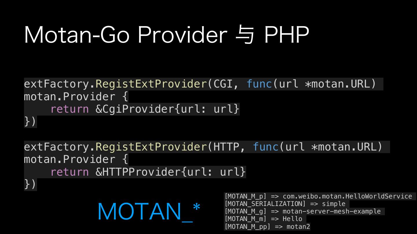 25 .Motan-Go Provider 与 PHP extFactory.RegistExtProvider(CGI, func(url *motan.URL) motan.Provider { return &CgiProvider{url: url} }) extFactory.RegistExtProvider(HTTP, func(url *motan.URL) motan.Provider { return &HTTPProvider{url: url} }) [MOTAN_M_p] => com.weibo.motan.HelloWorldService MOTAN_* [MOTAN_SERIALIZATION] => simple [MOTAN_M_g] => motan-server-mesh-example [MOTAN_M_m] => Hello [MOTAN_M_pp] => motan2